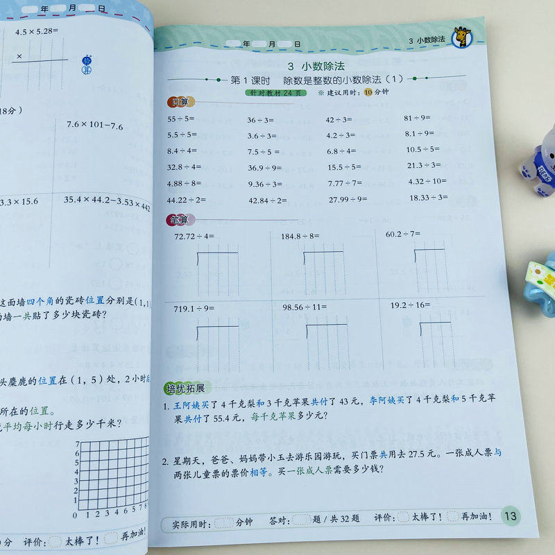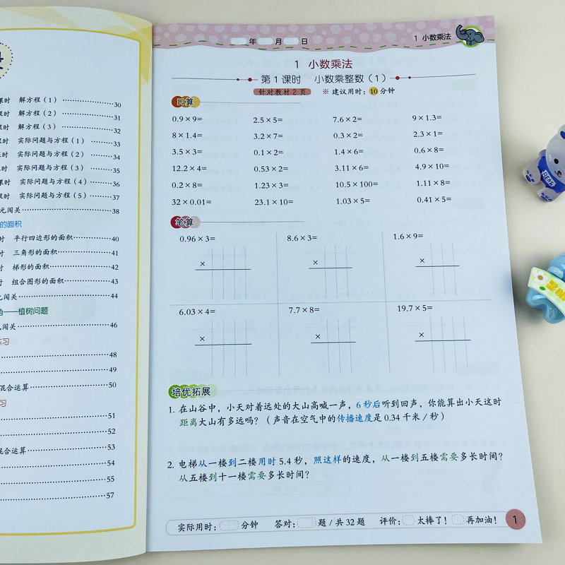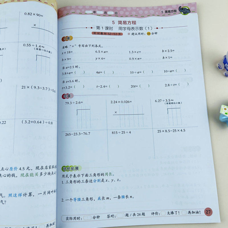 小学数学课时培优同步练习册五年级上册人教版基础训练培优拓展口算竖式脱式小数乘法小数除法混合简易方程多边形的面积位置可能性