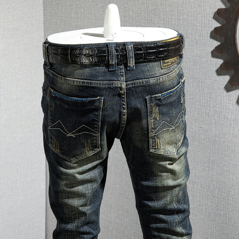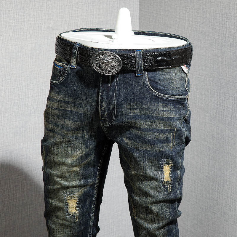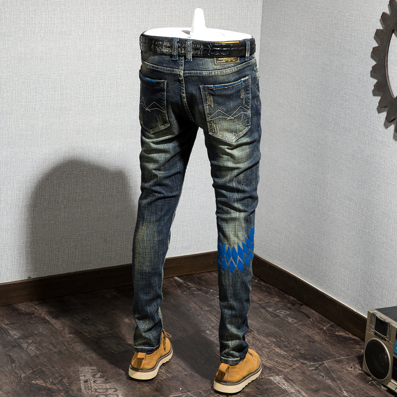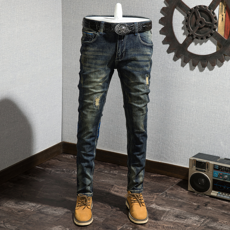 秋冬新款弹力修身小直筒牛仔裤男日系复古休闲长裤子破洞补丁潮流