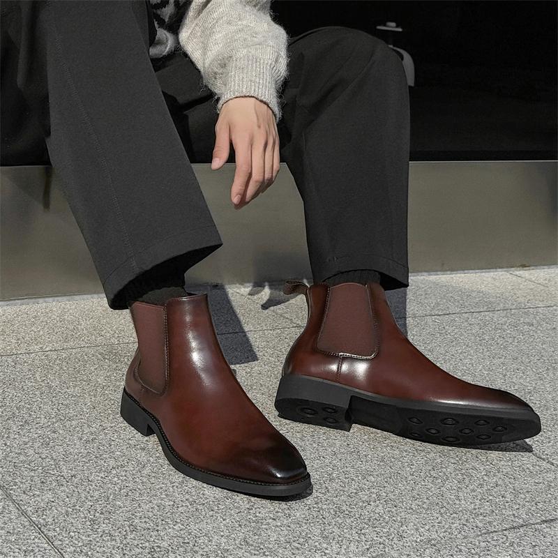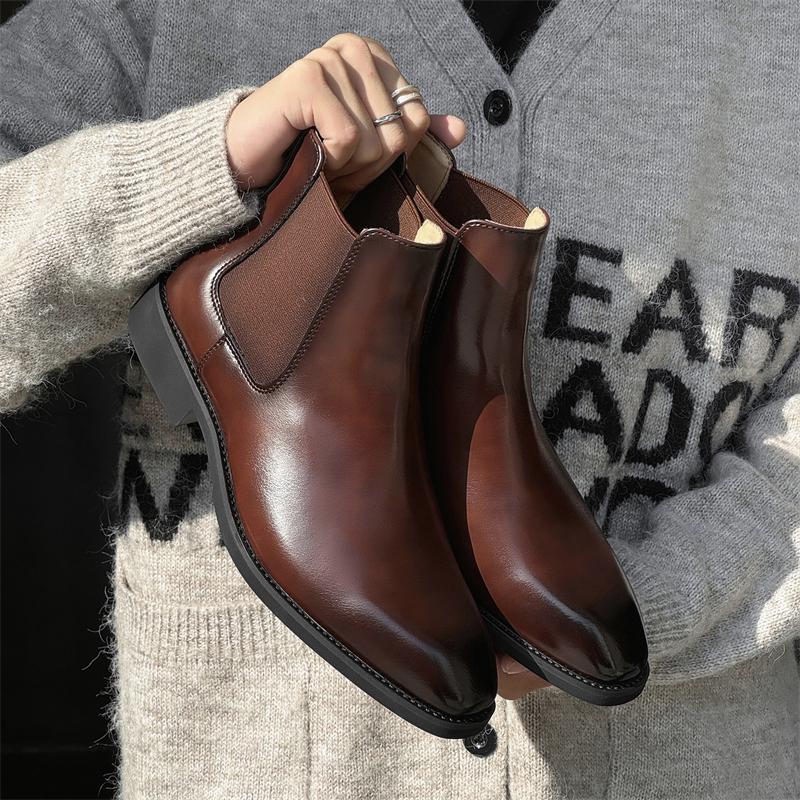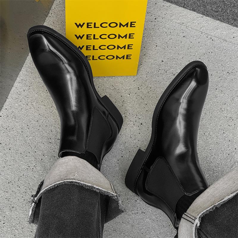 时尚新款英伦男士尖头皮鞋套脚中高帮商务正装发型师切尔西短靴子
