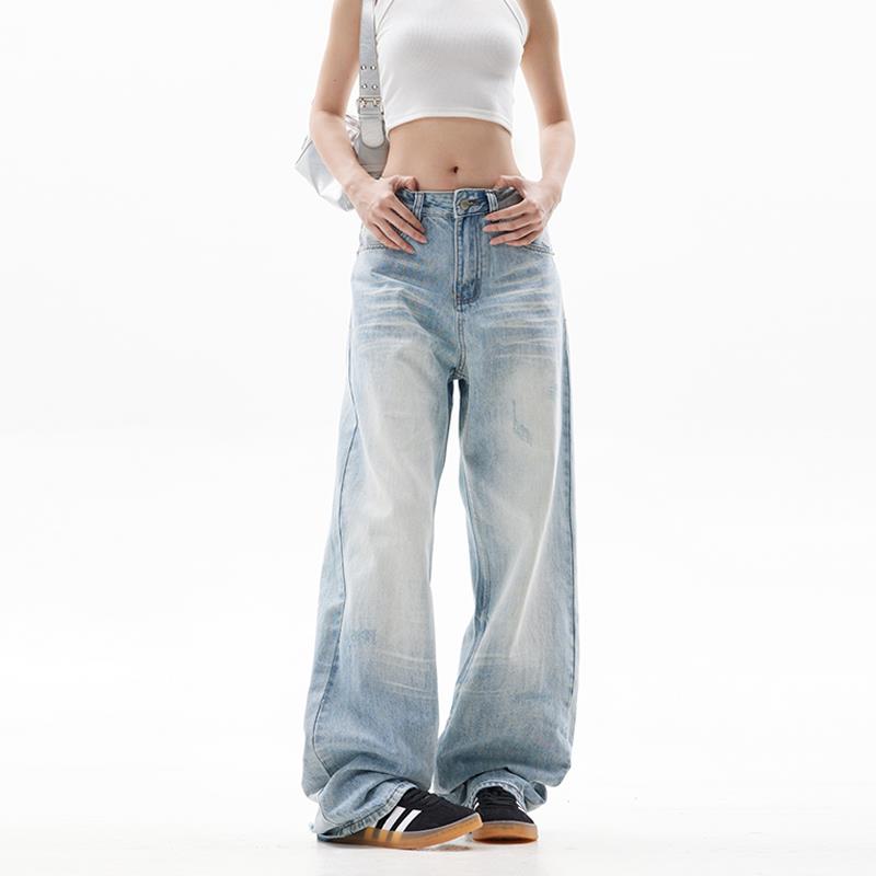 YOOTDS美式复古浅蓝色牛仔裤女直筒休闲阔腿宽松水洗猫须潮牌裤子