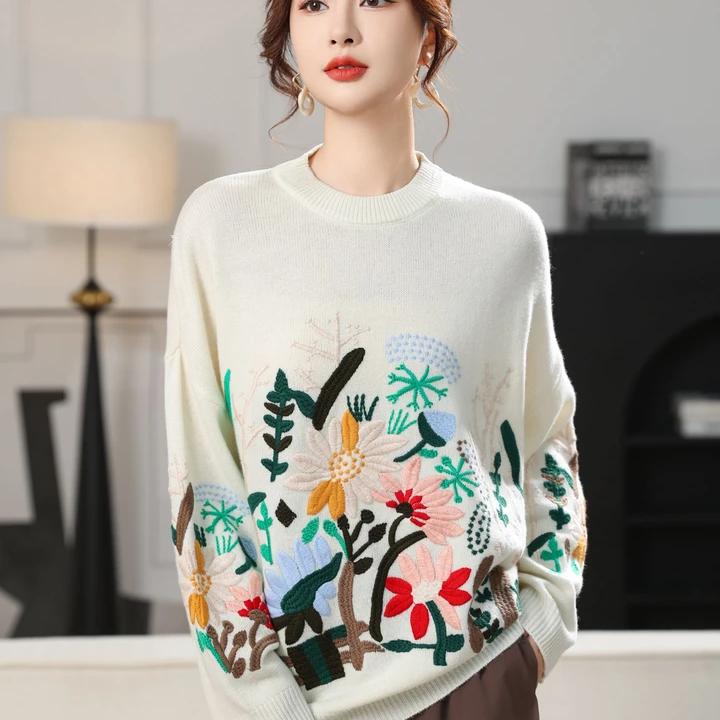羊绒羊毛圆领加厚重工万针刺绣提花针织衫宽松长袖保暖花朵套头衫
