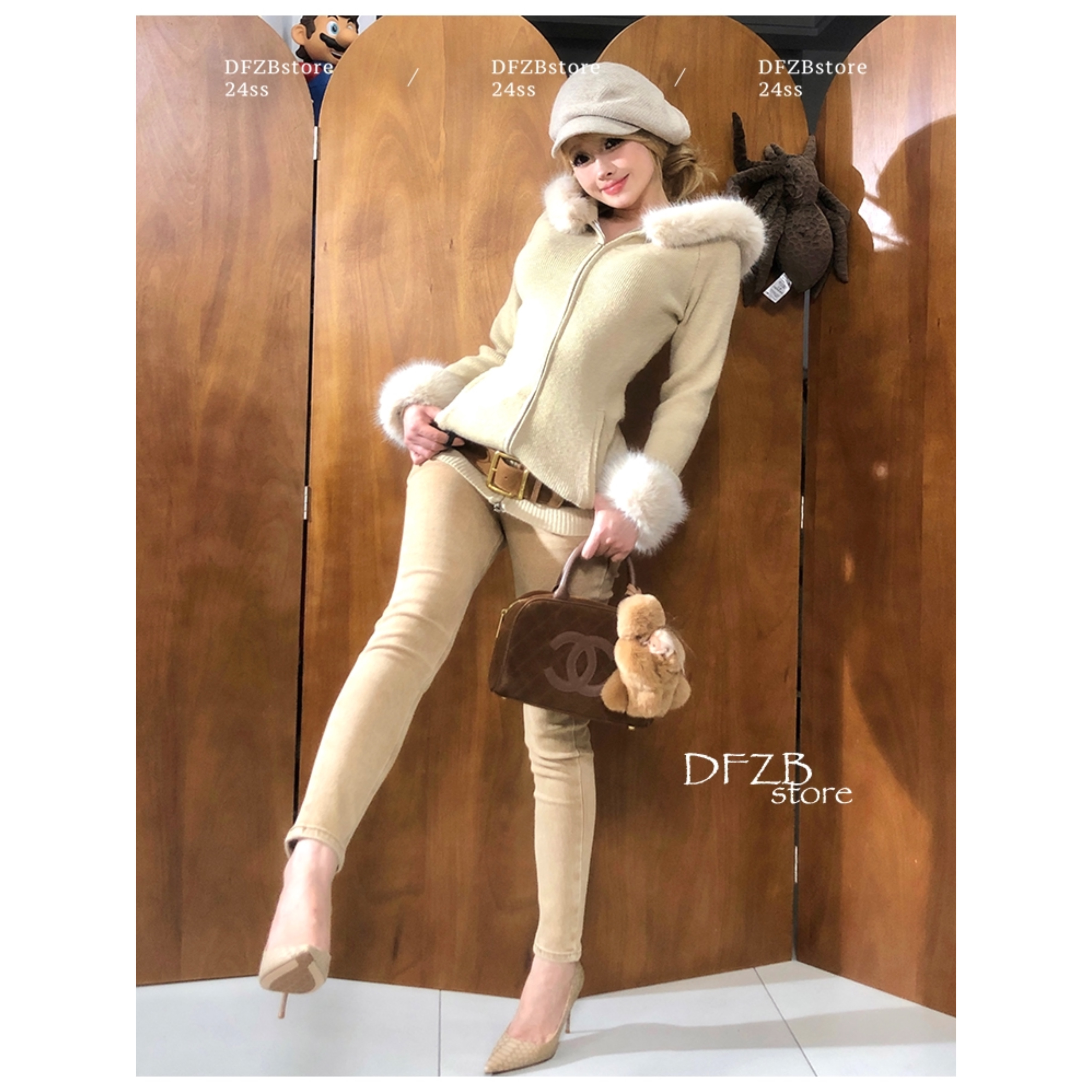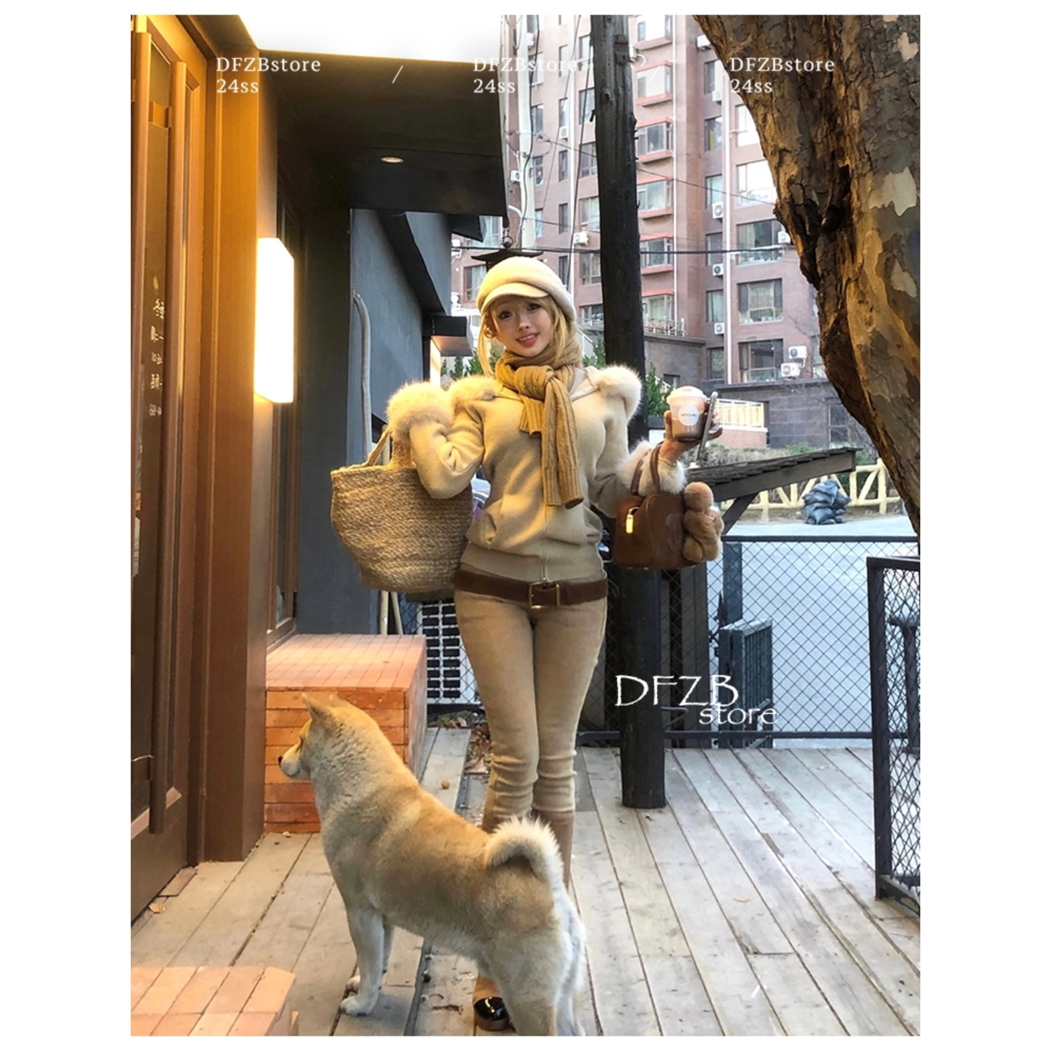 DFZBstore 黄油小熊~软糯毛领连帽加长款收腰外套&高腰9分烟管裤
