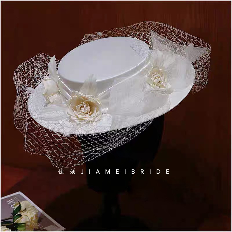 新款法式复古白色礼帽女英伦风优雅名媛小香风网纱帽子新娘头饰