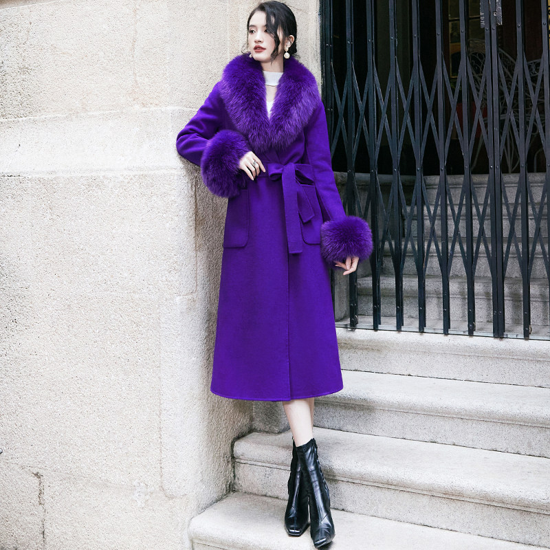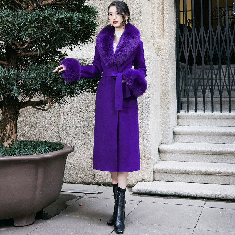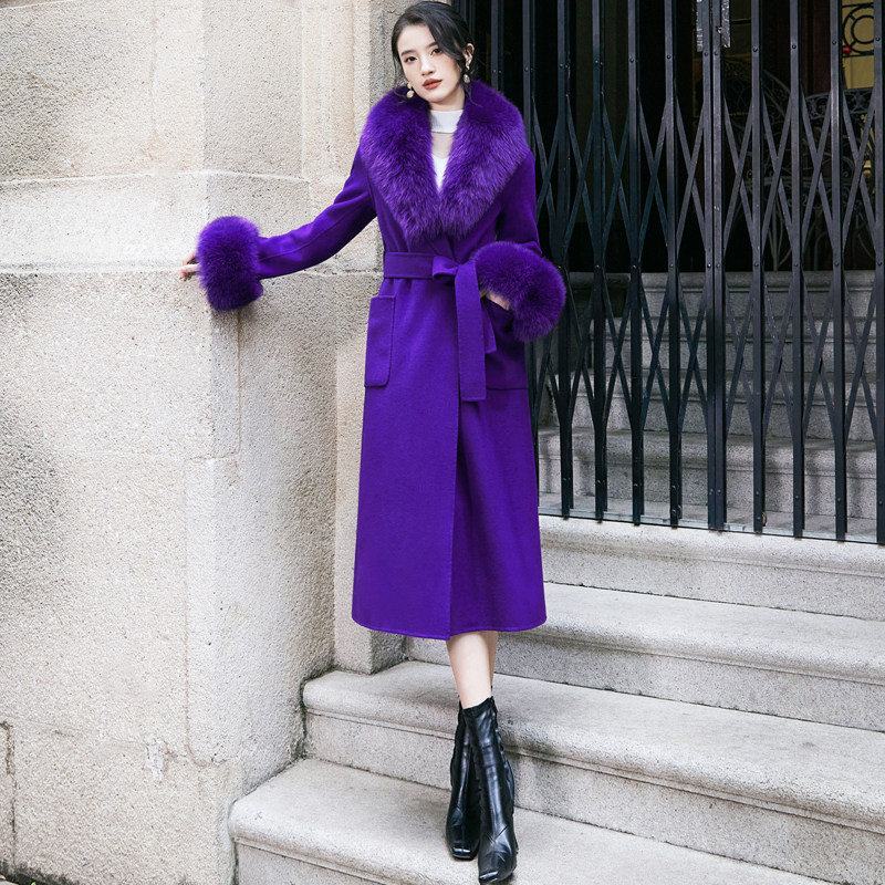 紫色双面羊绒大衣女中长款过膝2024新款高端狐狸毛领毛呢外套秋冬