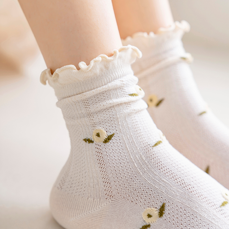 月子袜产后薄款袜子女纯棉中筒袜孕妇女袜日系花边长袜春秋堆堆袜