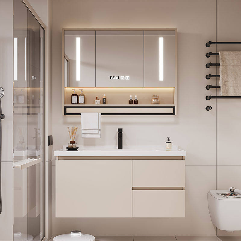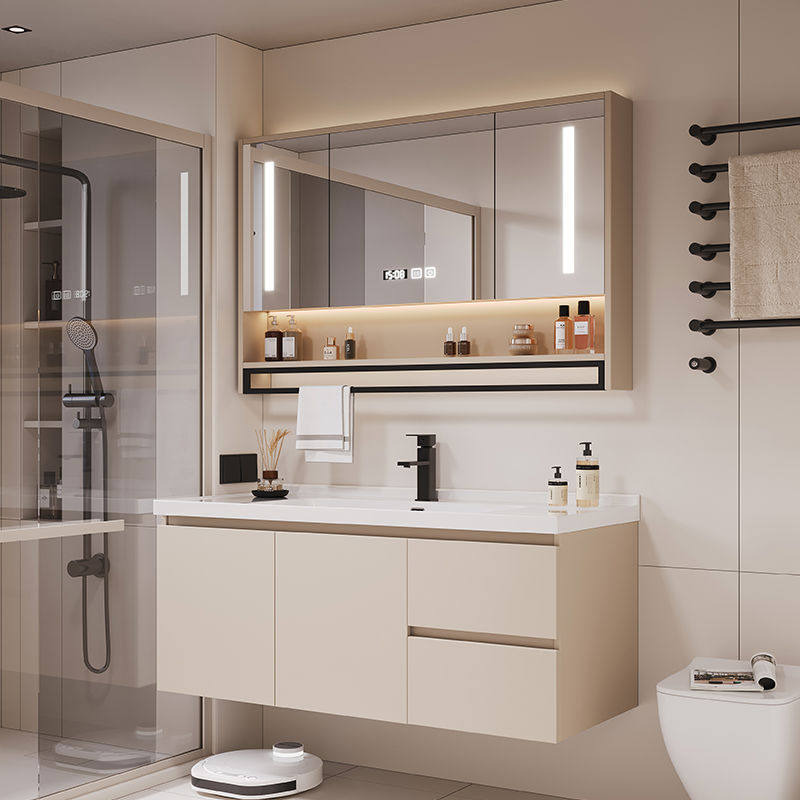 现代简约奶茶色实木浴室柜组合陶瓷一体盆卫生间洗漱台洗脸洗