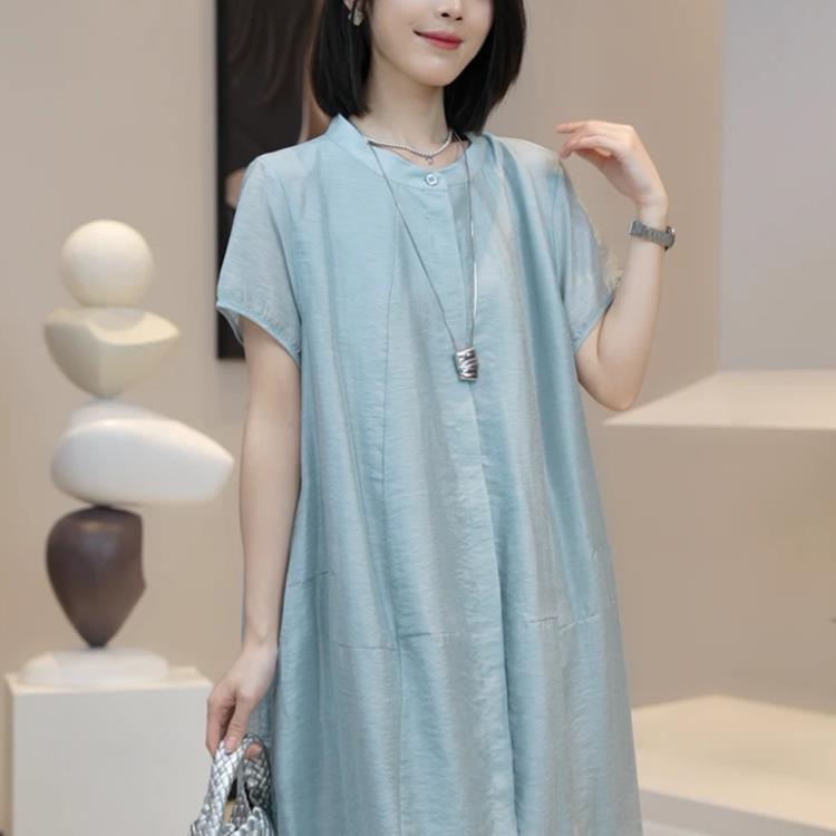 天丝亚麻高级感减龄短袖连衣裙女夏季裙子大码休闲宽松显瘦中长裙