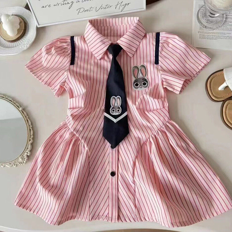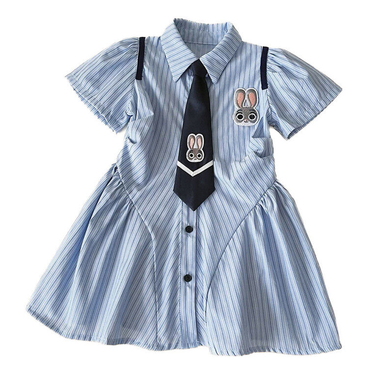 韩版女童蓝色条纹连衣裙夏季兔子领带装饰学院风短袖裙