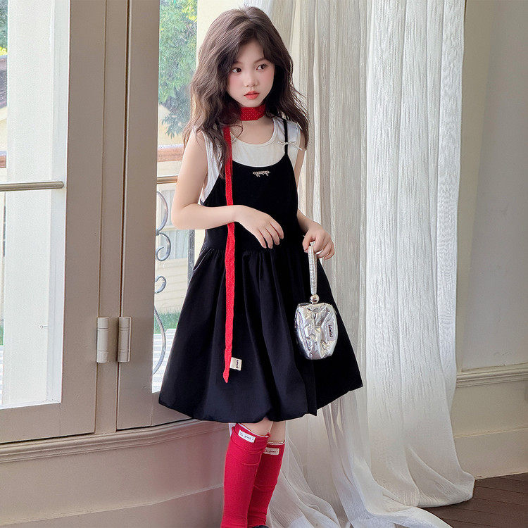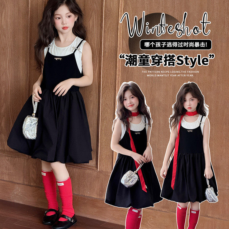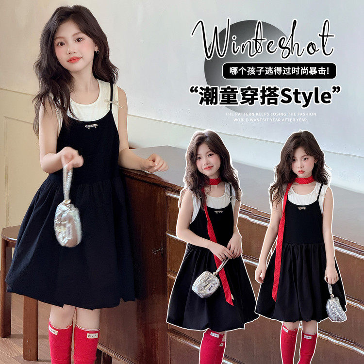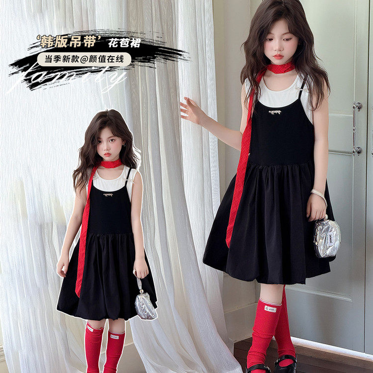韩版吊带连衣裙女童夏季黑色短裙2-16岁中长款裙子