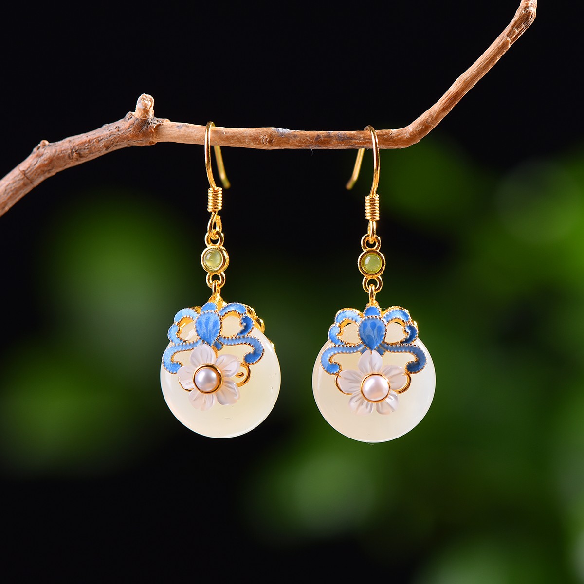天然和田玉白玉925银镶嵌珐琅古风轻奢平安扣玉石耳坠耳环耳饰