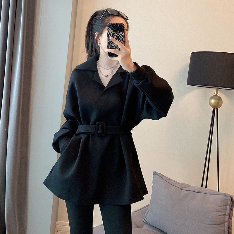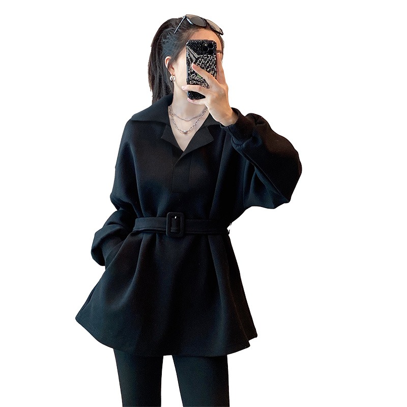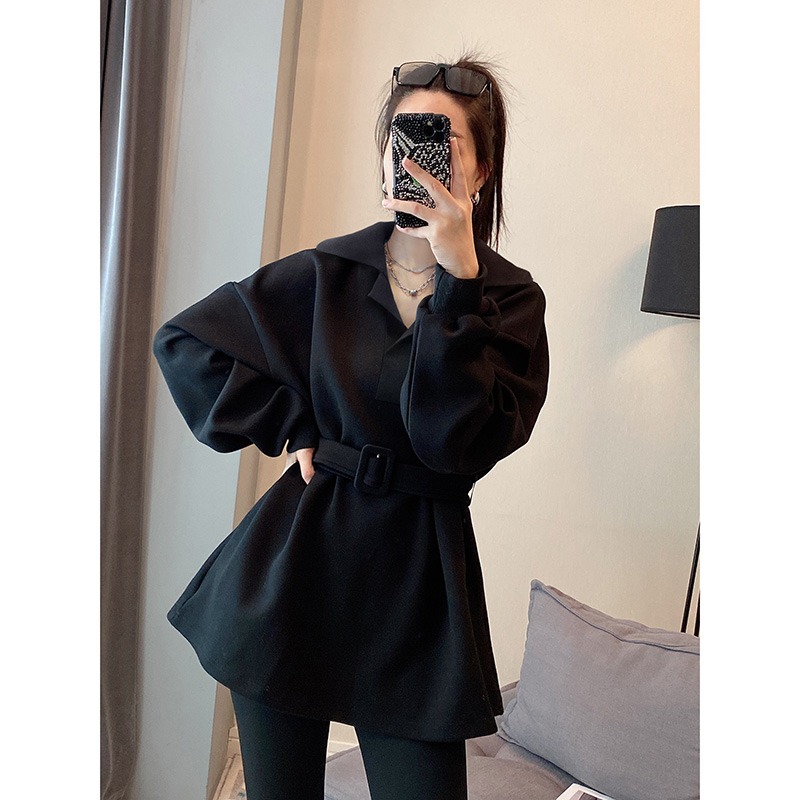 设计感洋气黑色长袖卫衣女春秋新款爆大码胖mm收腰遮肚中长款上衣