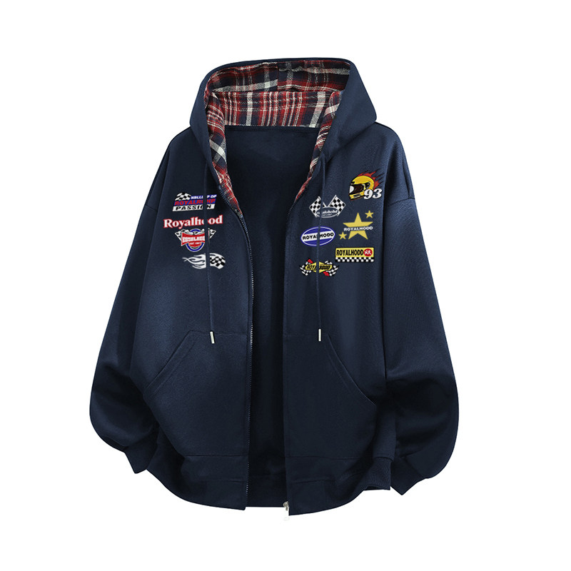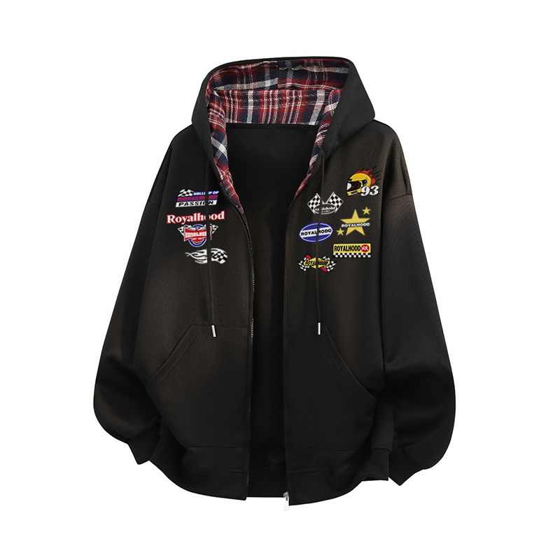 美式赛车机车风格纹无性别主义拼色拉链开衫卫衣外套