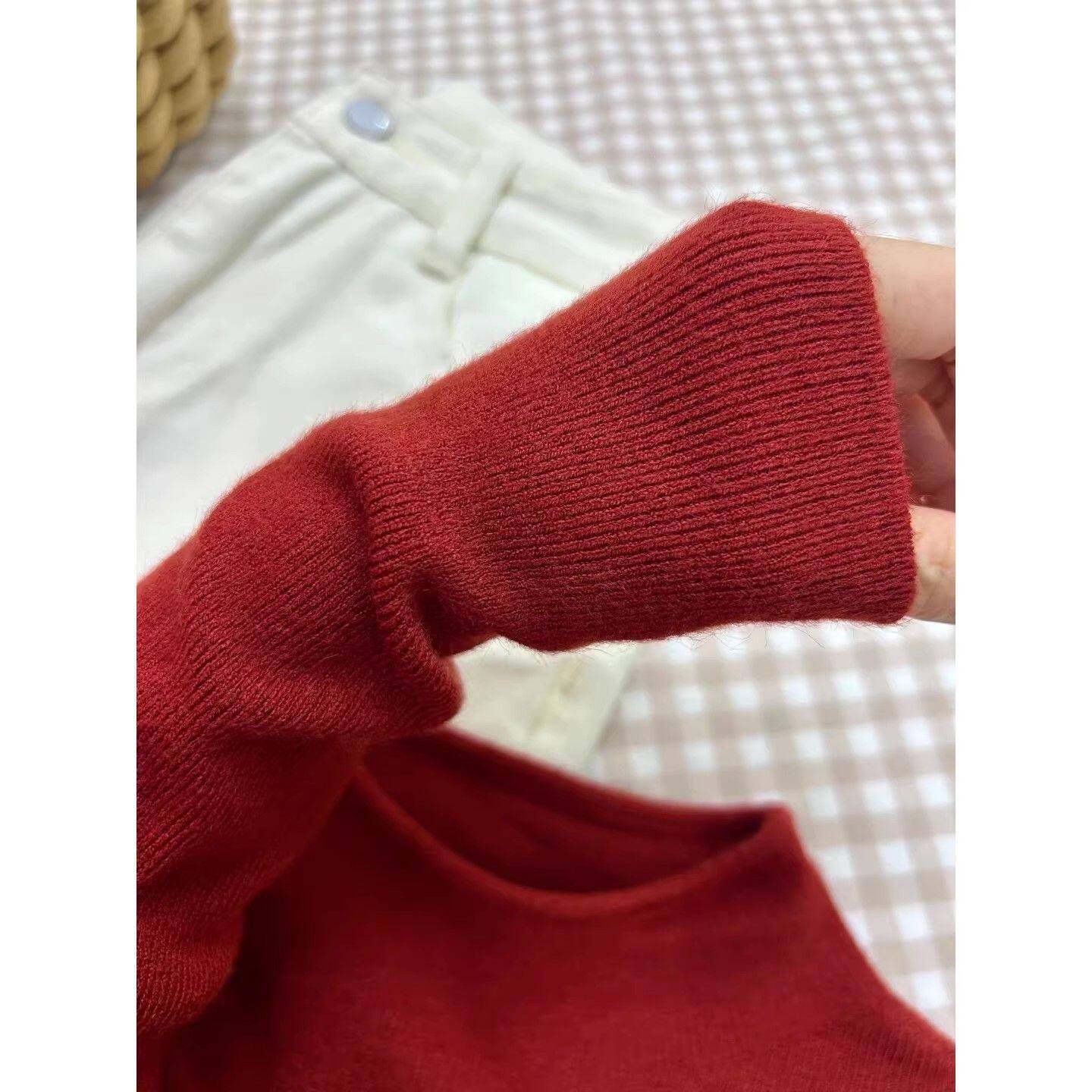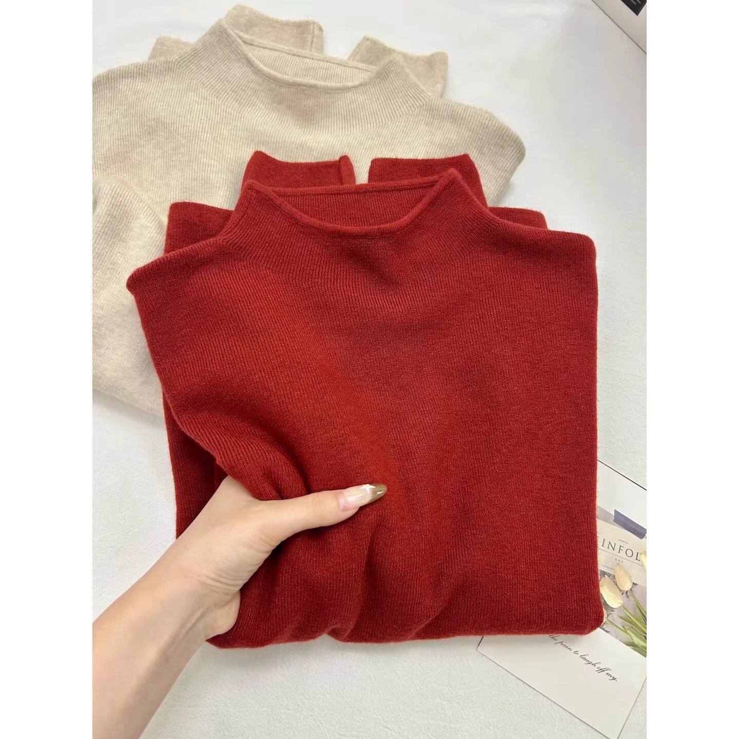 圣诞新年红毛衣内搭软糯半高领针织上衣女秋冬气质简约百搭打底衫