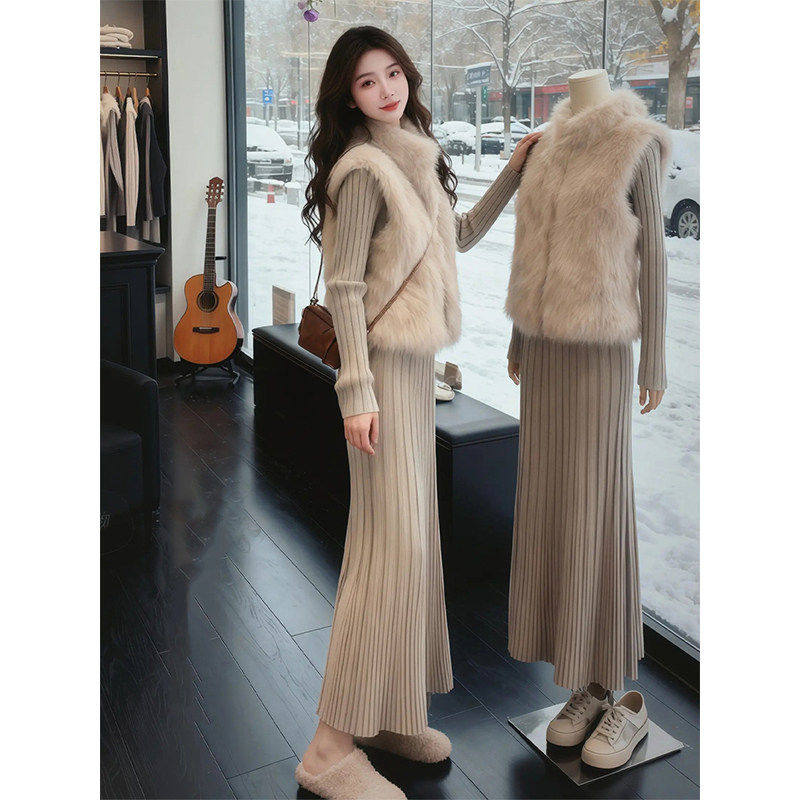 冬季韩系套装女气质温柔风奶fufu毛绒马甲搭针织鱼尾洋装两件套