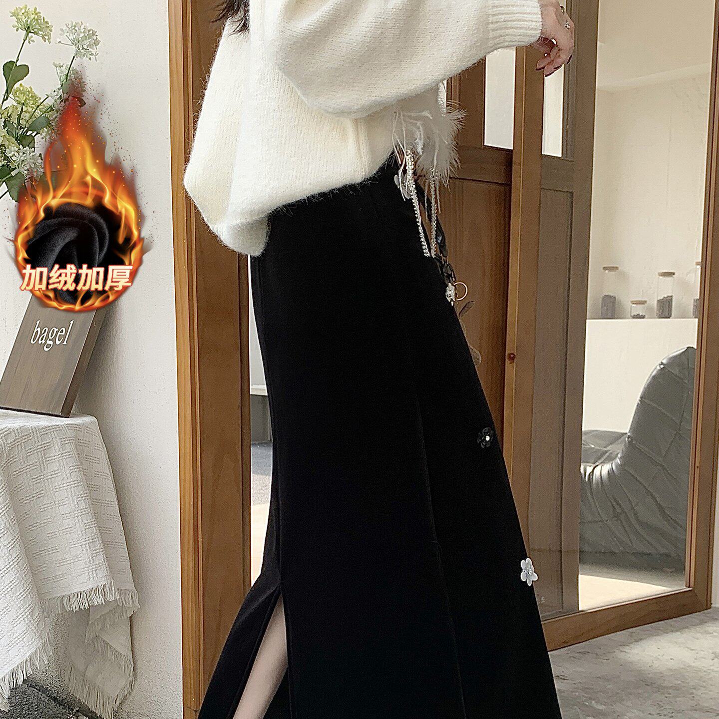 2026年秋冬高定手工坊立体定位定珠 黑色直筒丝绒开叉半身裙
