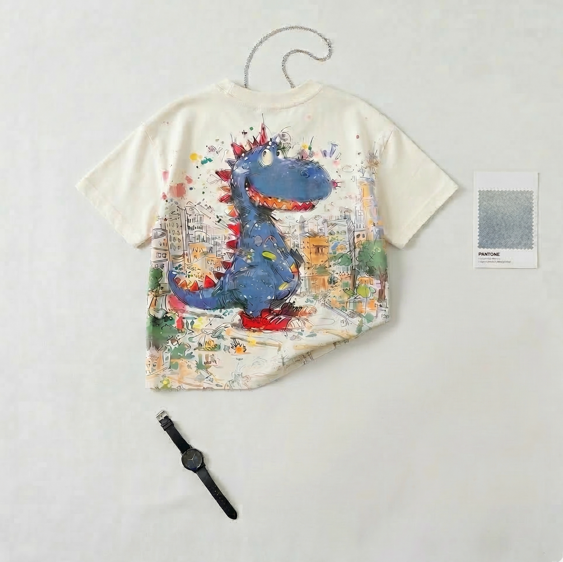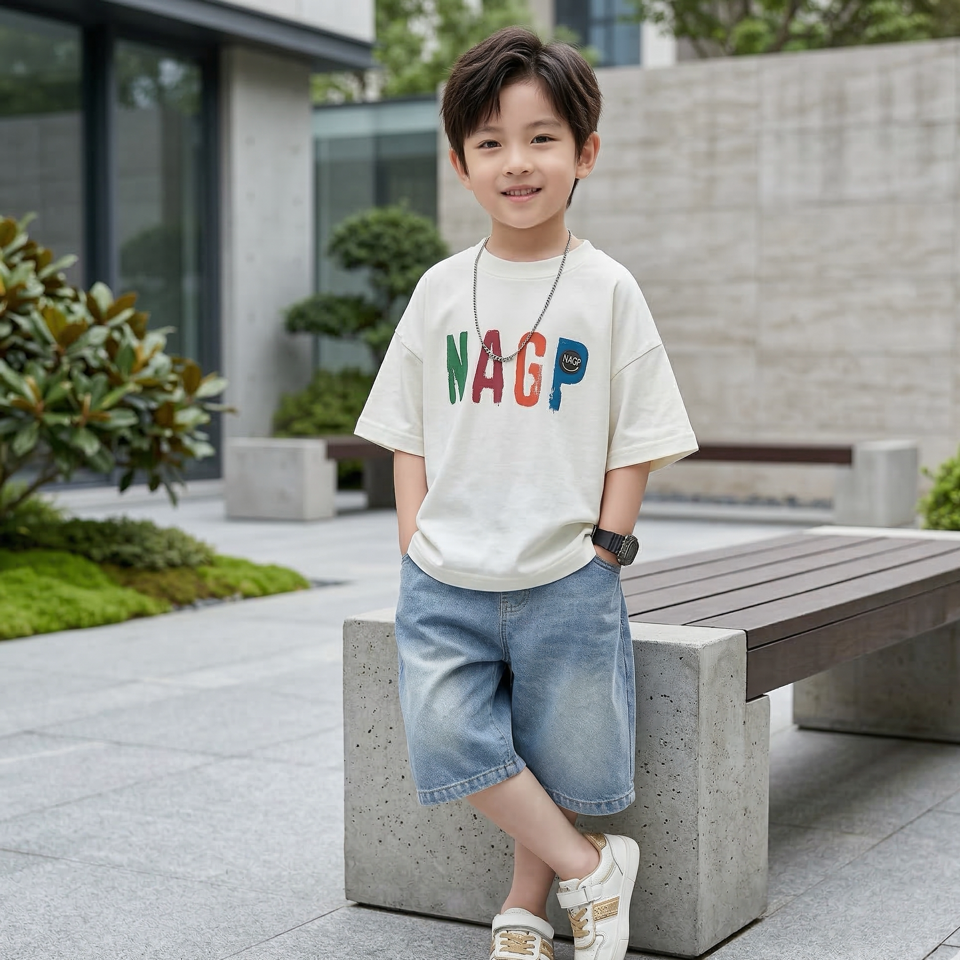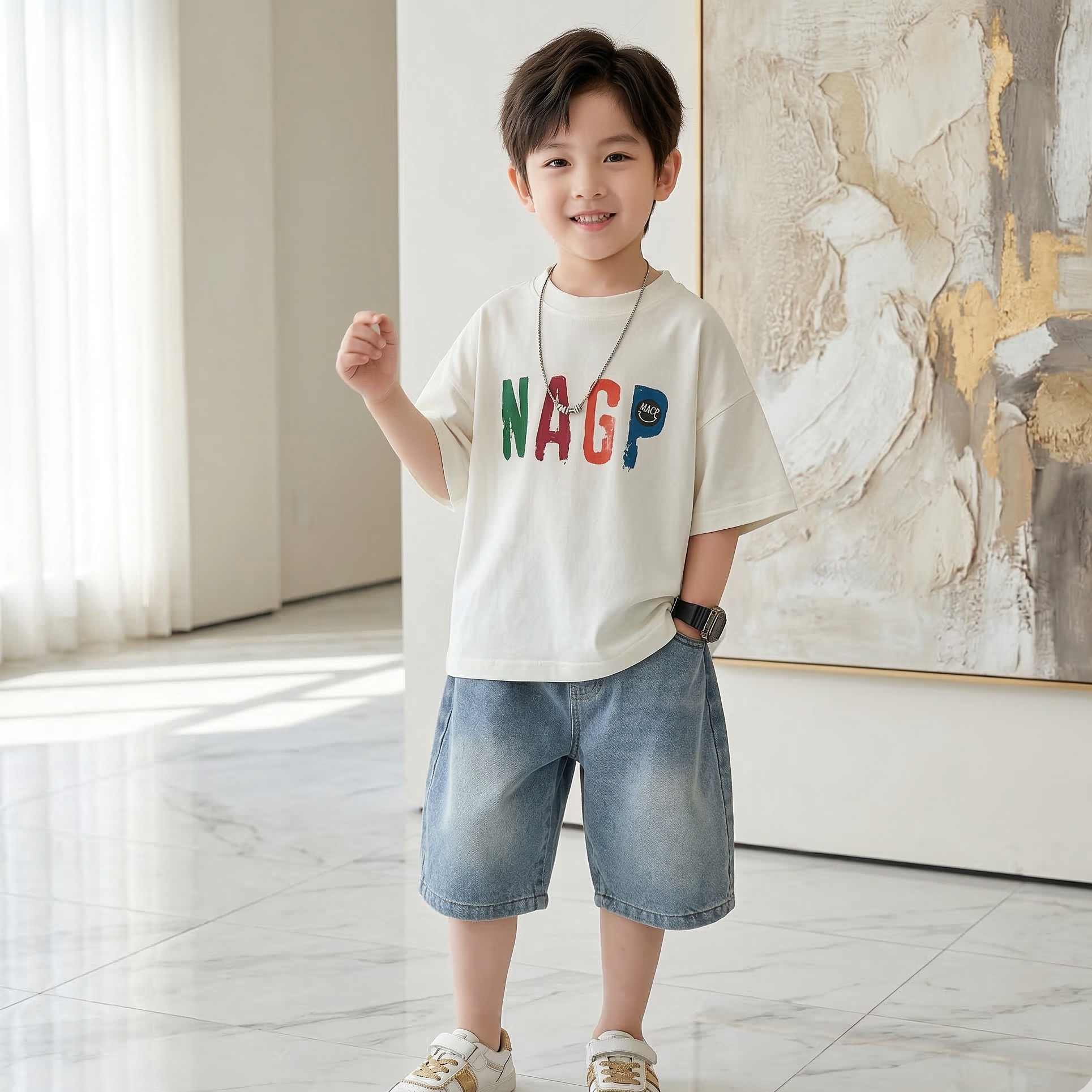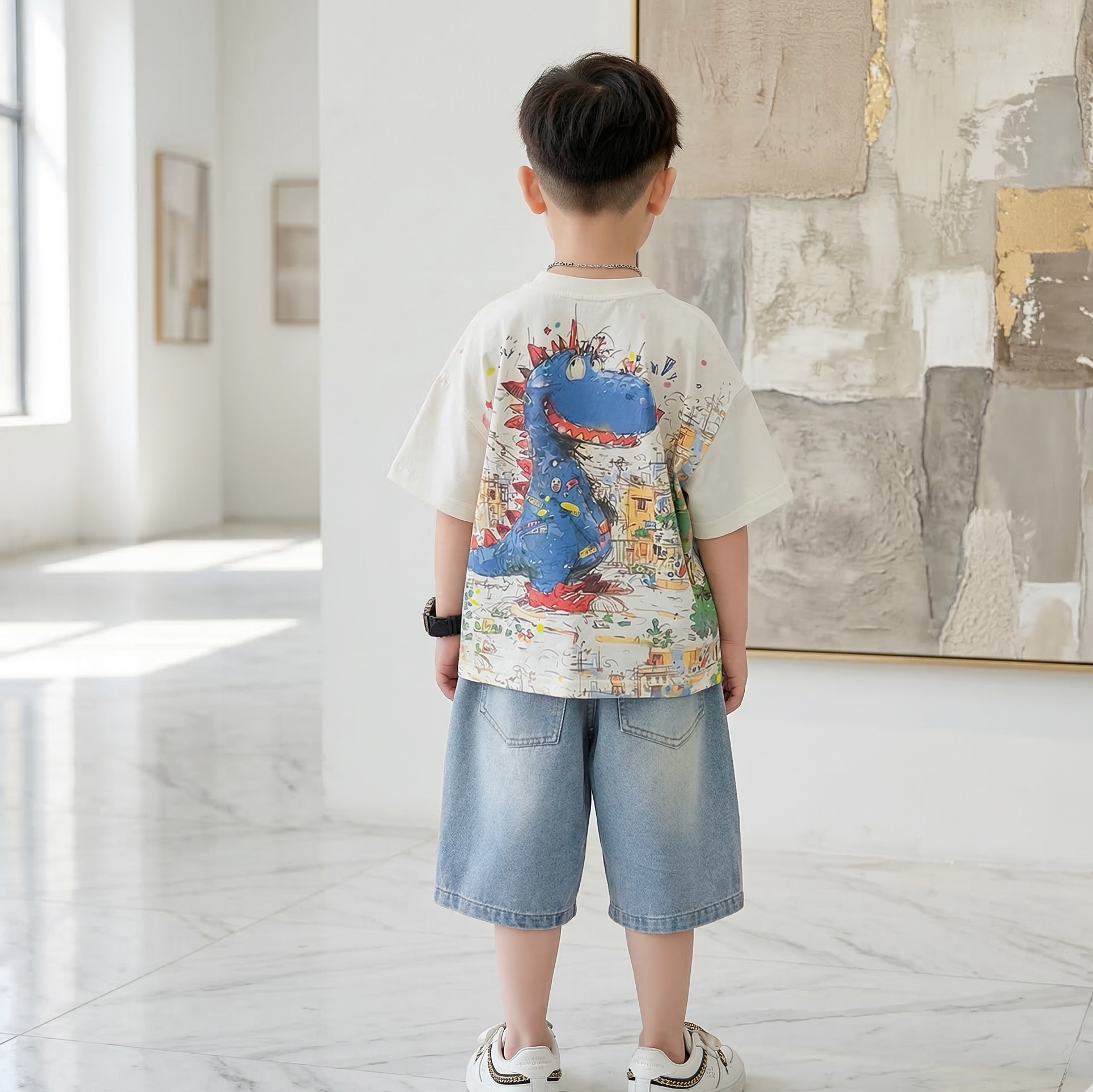 韩版男童卡通恐龙印花短袖T恤牛仔中裤两件套夏季宝宝帅气套装