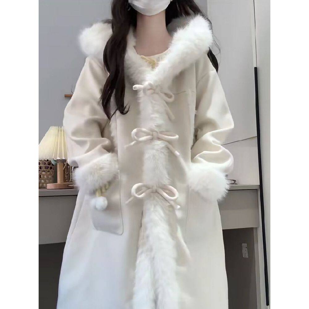 天山暮雪 冬装新款甜美气质连帽毛领设计蝴蝶结扣学院风毛呢大衣