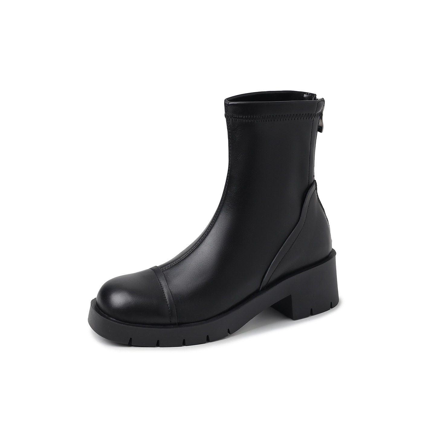 5.5cm粗跟圆头后拉链气质简约弹力瘦瘦靴2025冬百搭舒适好穿短靴