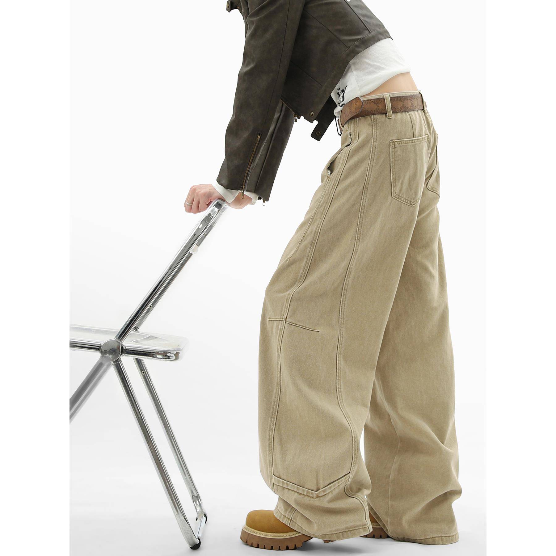 美式卡其色工装牛仔裤女男秋季高腰显瘦休闲裤复古做旧百搭弯刀裤