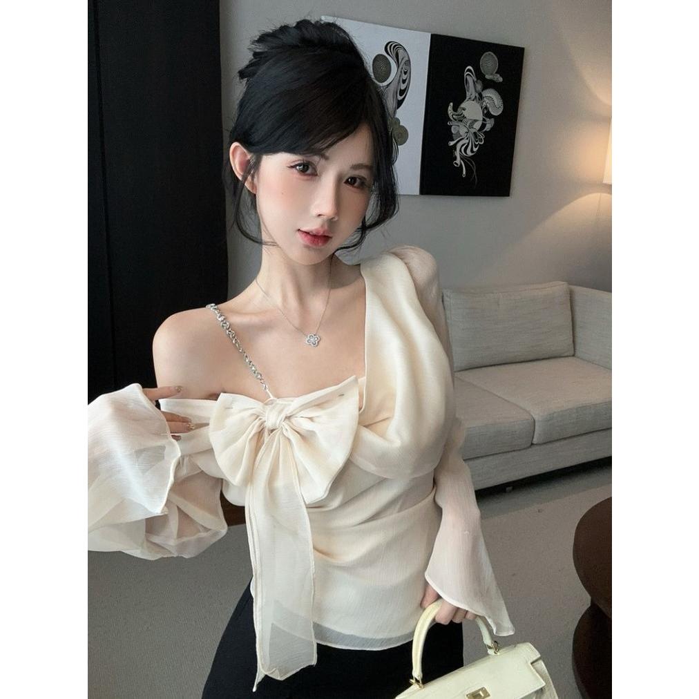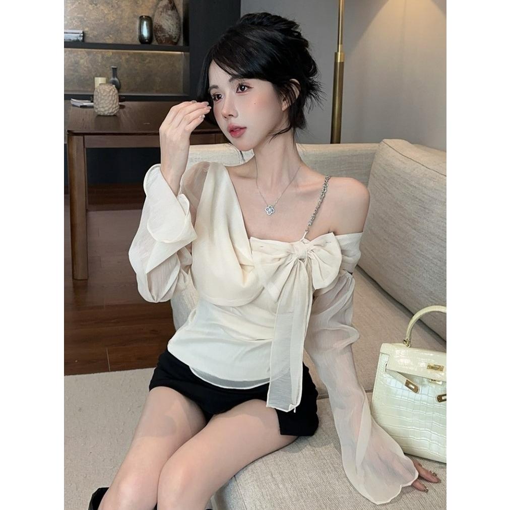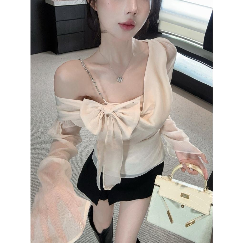实拍蝴蝶结少女链条露肩雪纺小香风衬衫实价