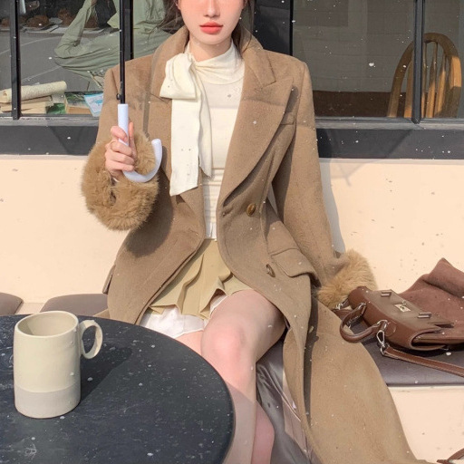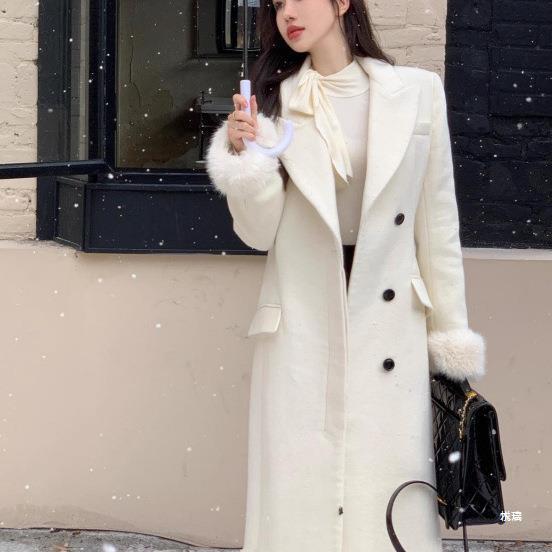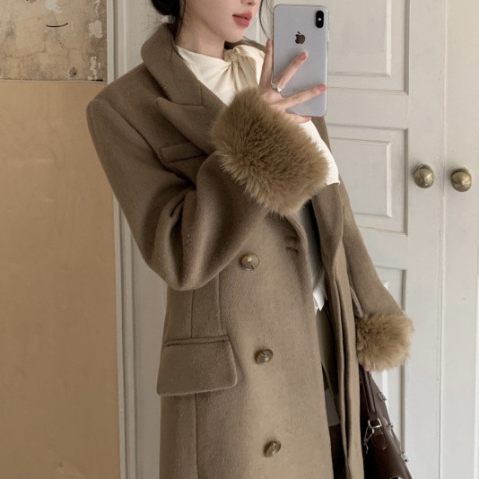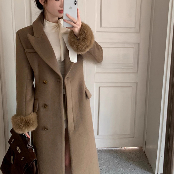 法式名媛气质过膝中长款呢子大衣女秋冬季毛毛袖套感毛呢直销