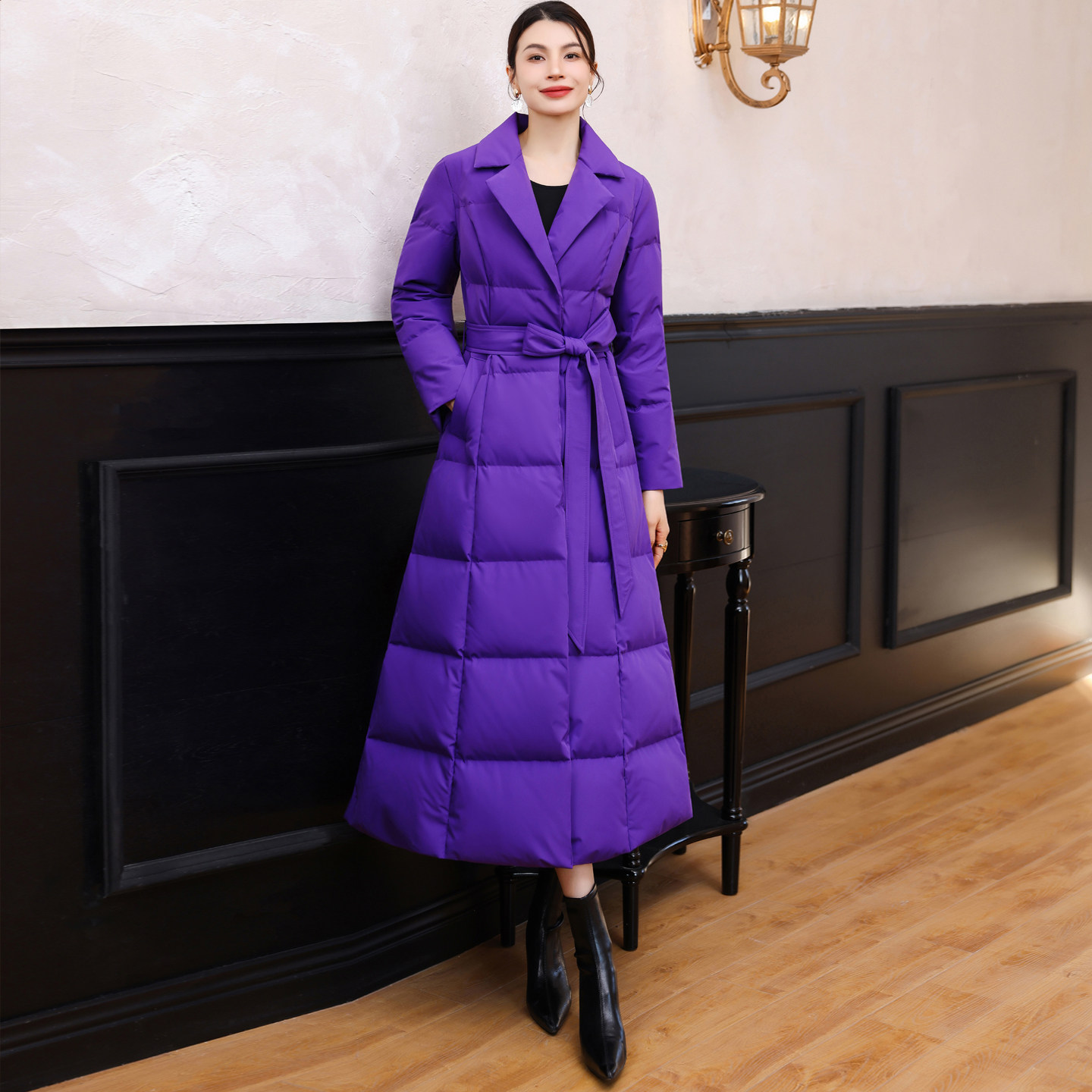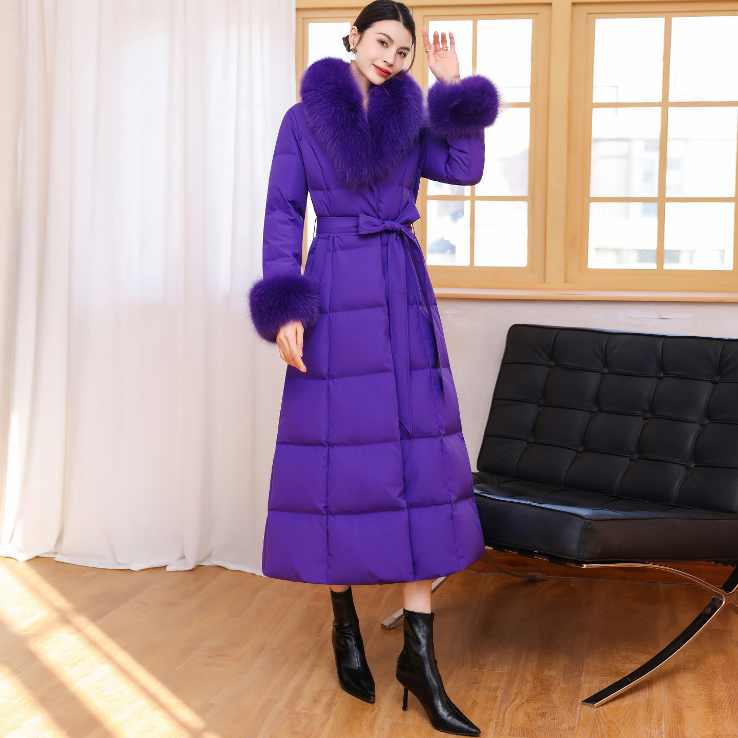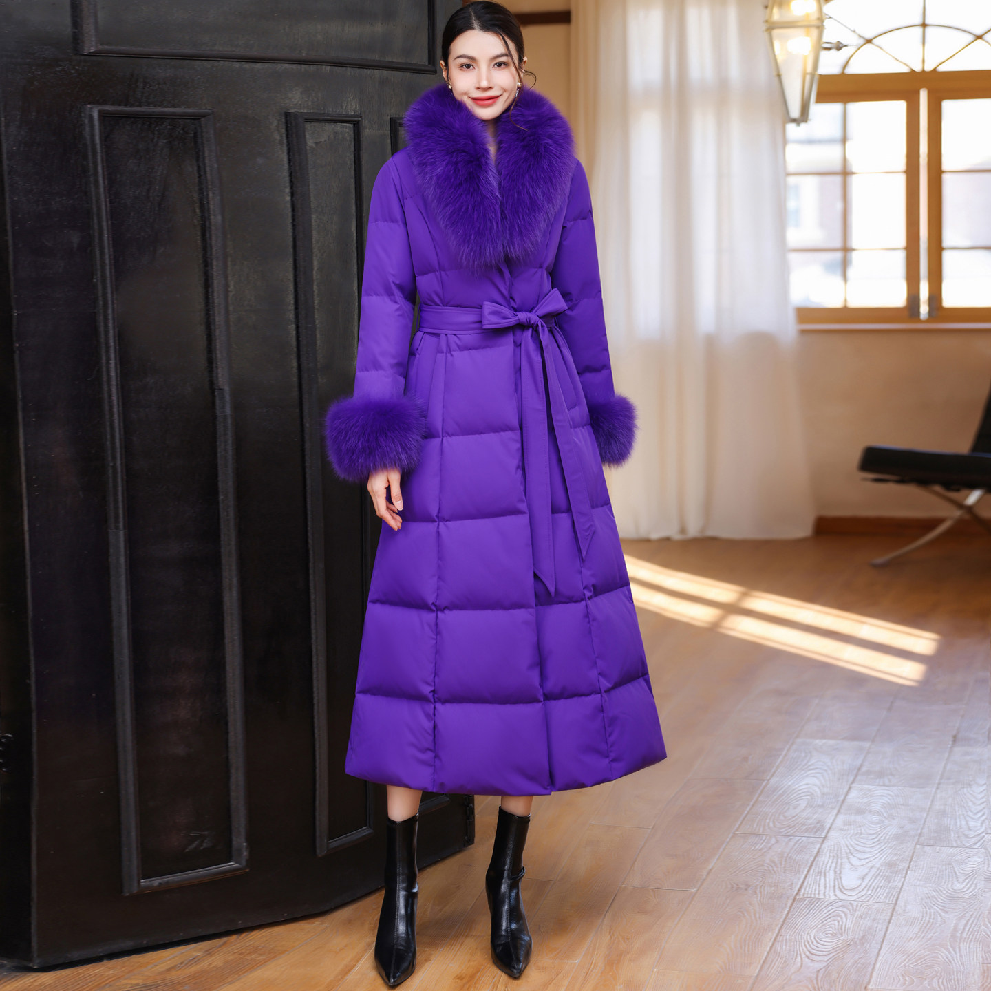 西装领过膝白鸭绒修身显瘦加厚保暖狐狸毛领紫色羽绒服女长款外套