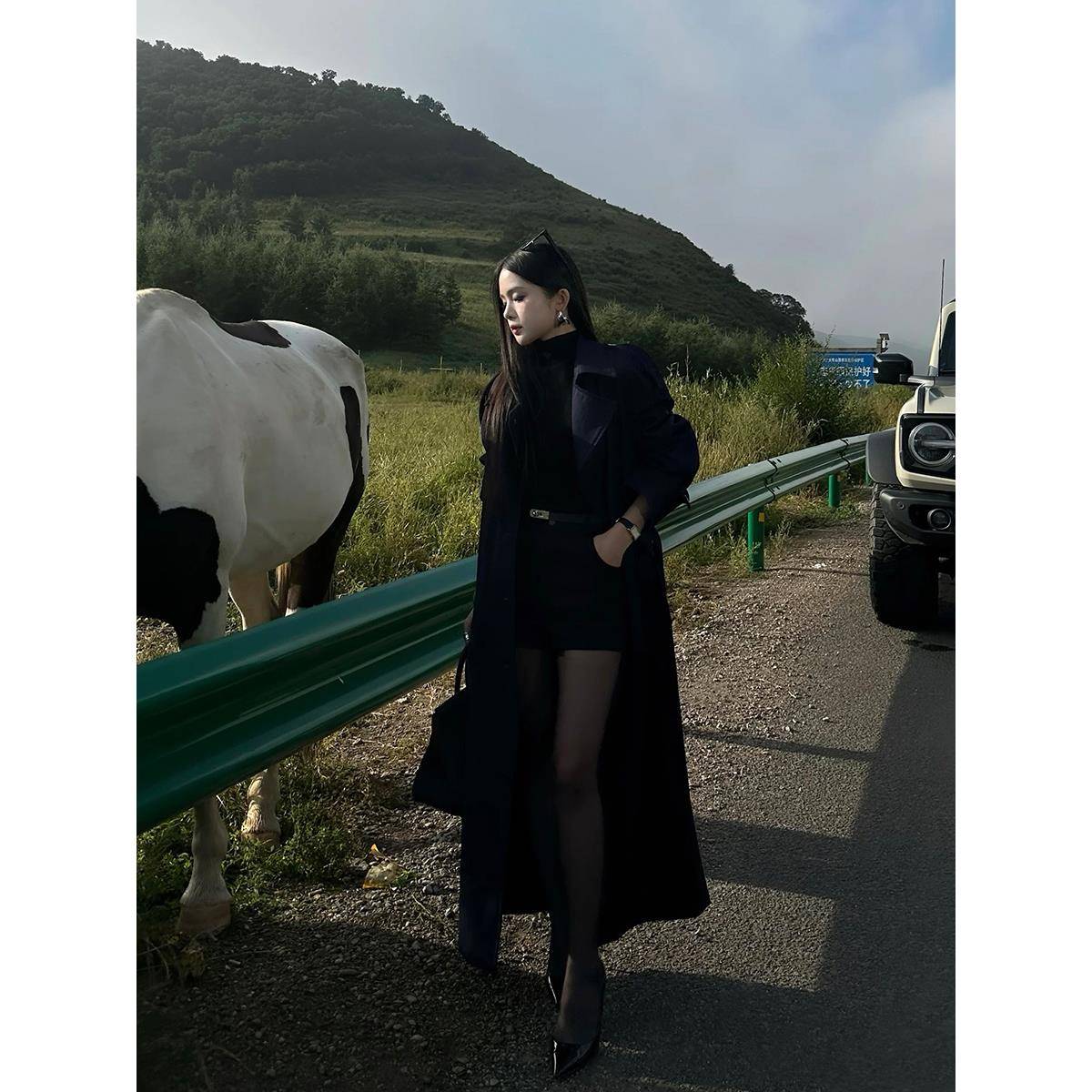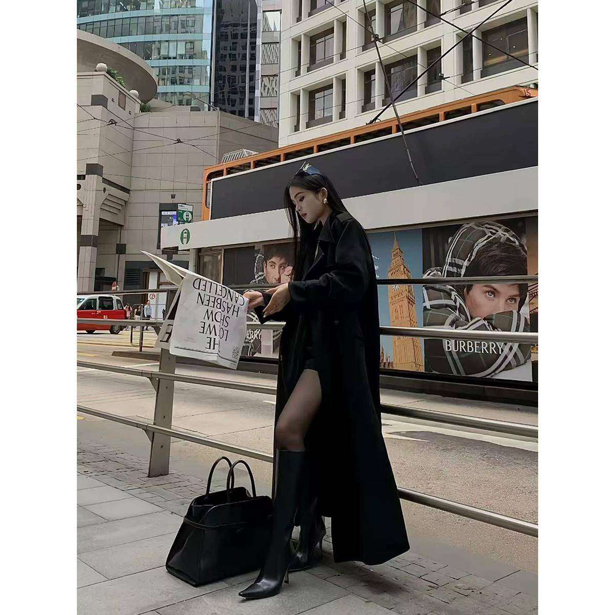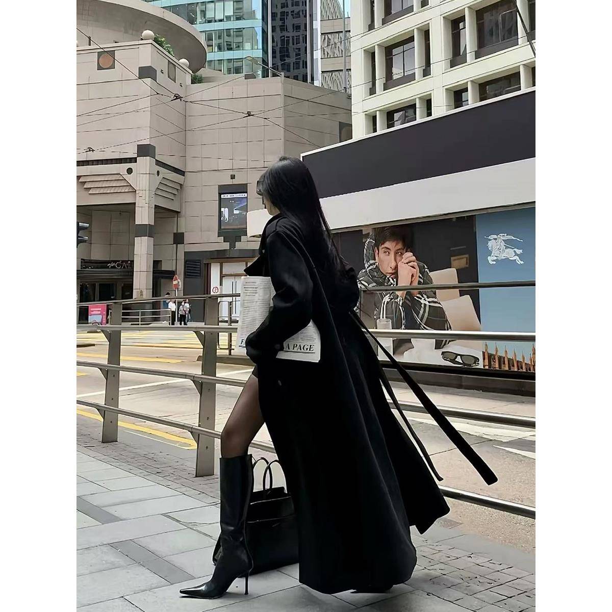 高挑女士黑色风衣,加长版,2025春秋季新款,高端英伦风宽松大衣