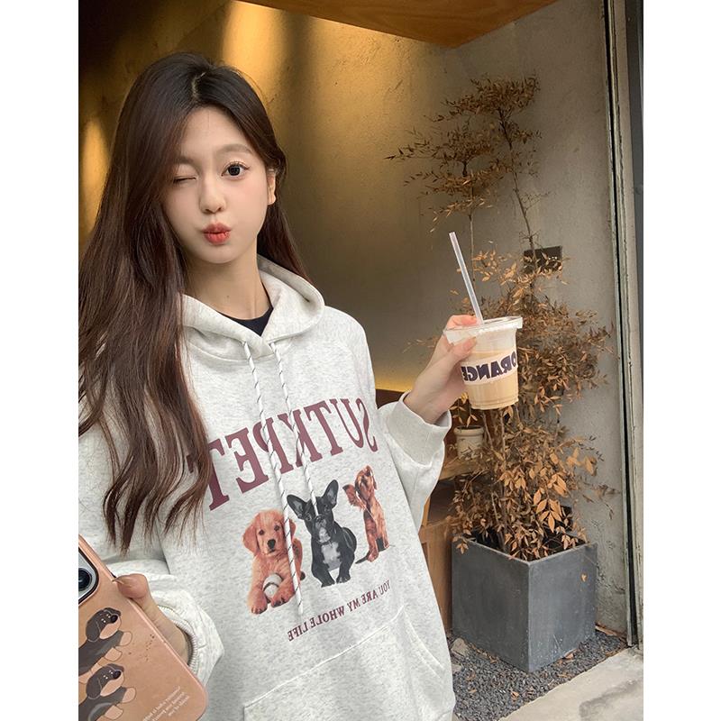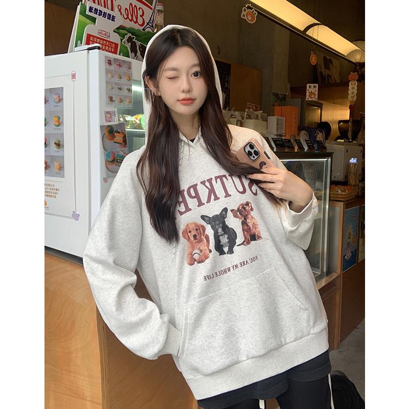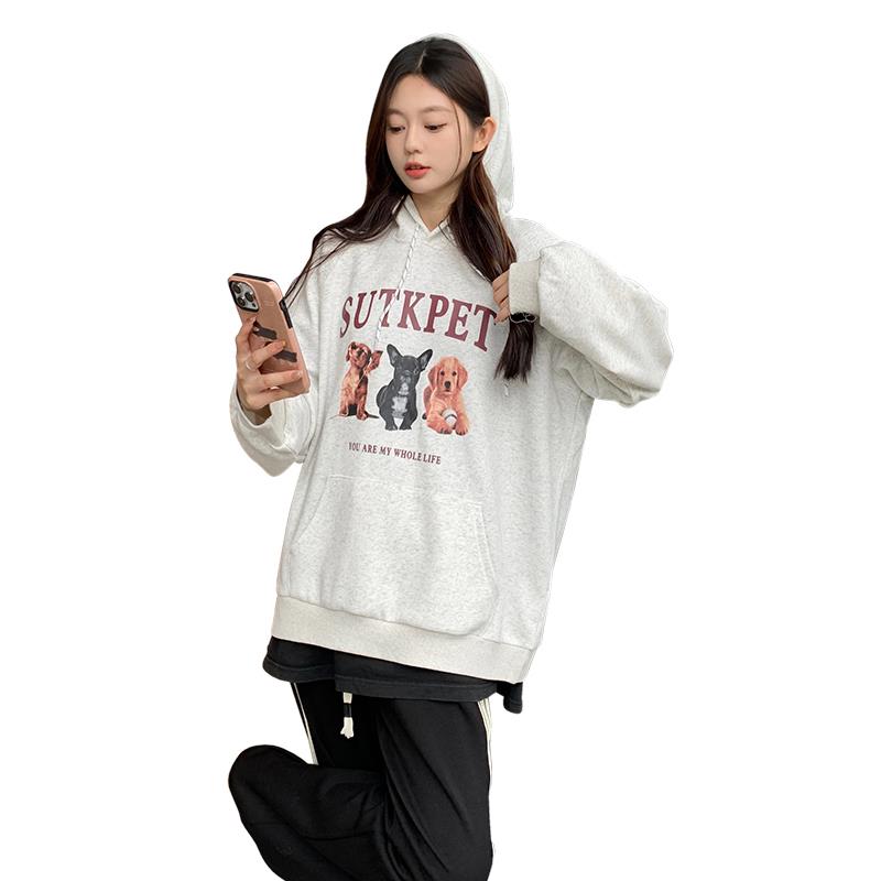 尚亚楠~大码女装狗狗印花卫衣绒衫休闲中性宽松型套头连帽卫衣