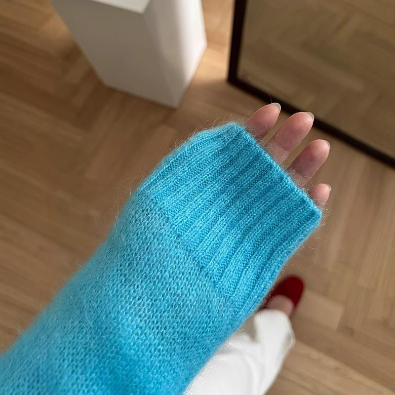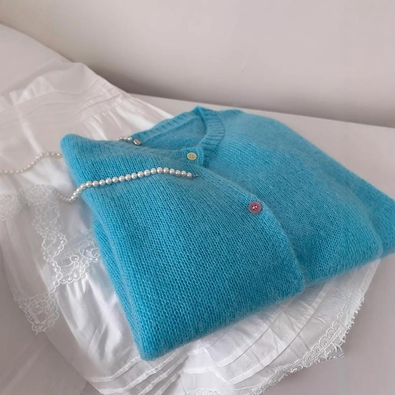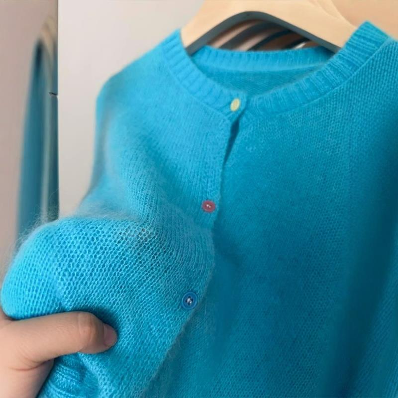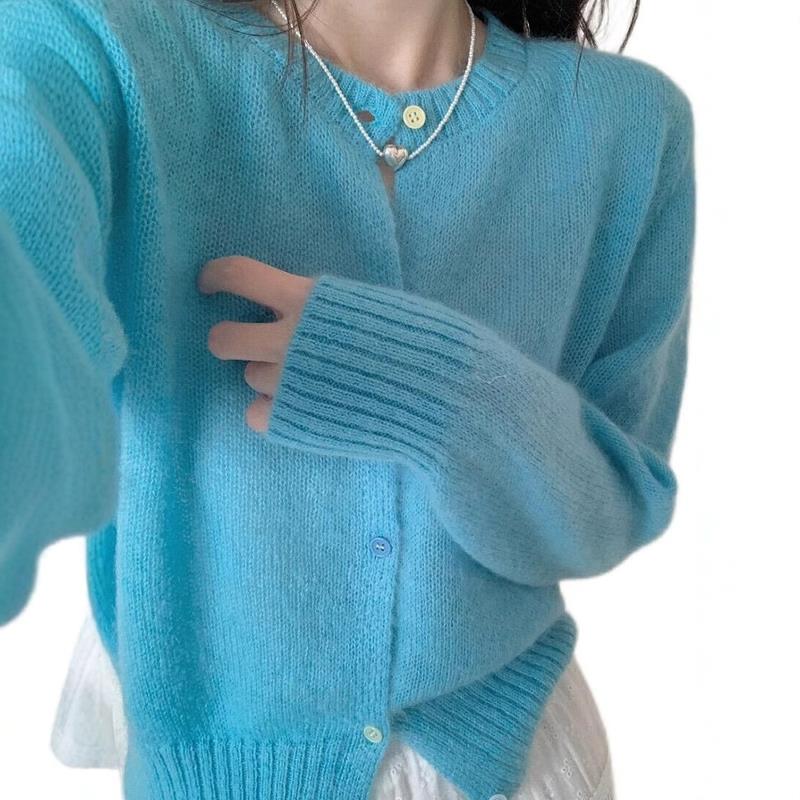 蓝色小香风马海毛圆领针织开衫女春秋温柔风软糯毛衣外套洋气上衣
