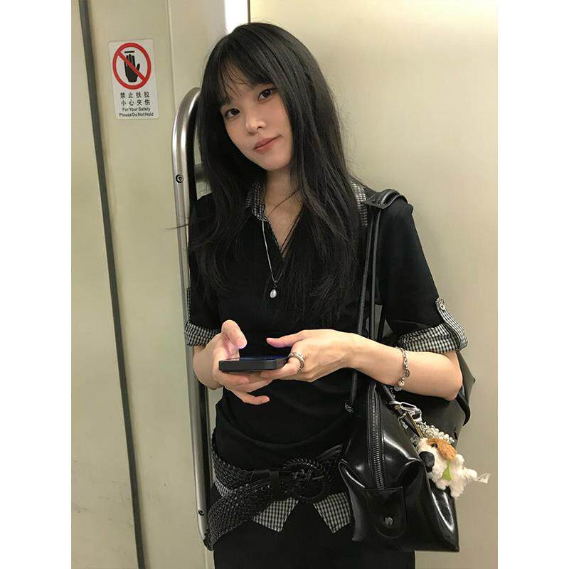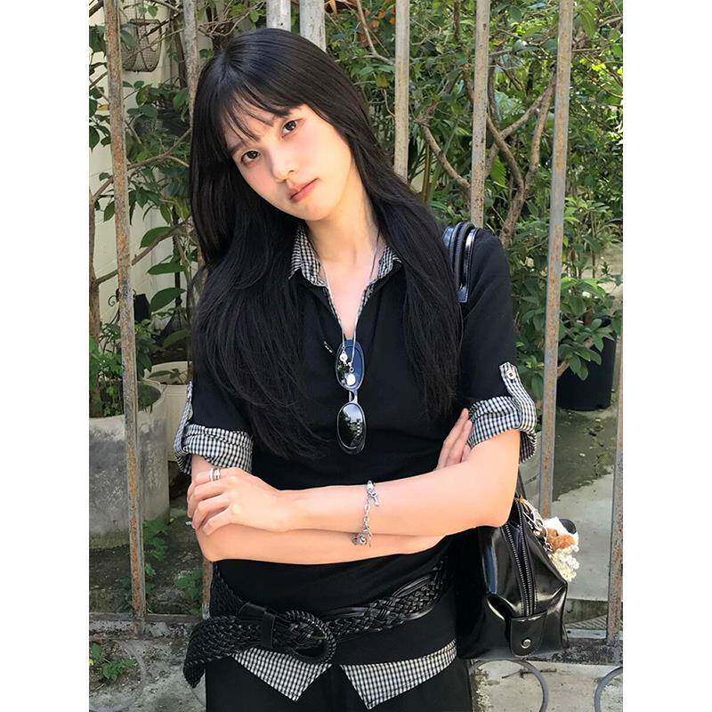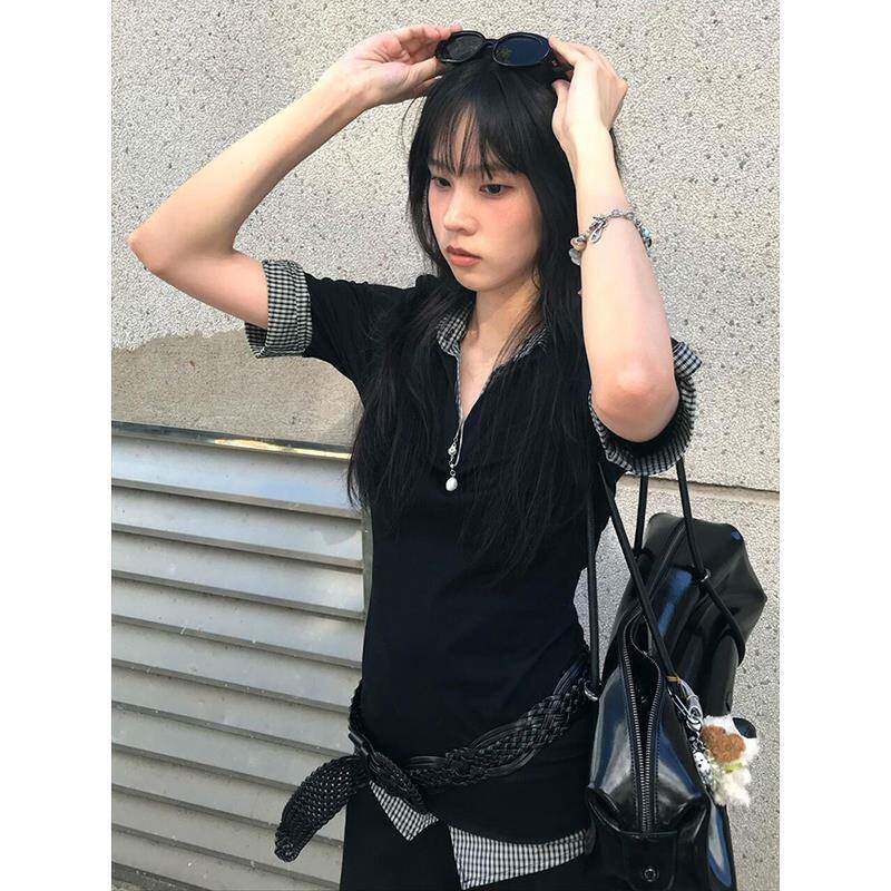 学院风polo衫短袖女夏季撞色格纹假两件修身T恤vintage甜辣上衣潮