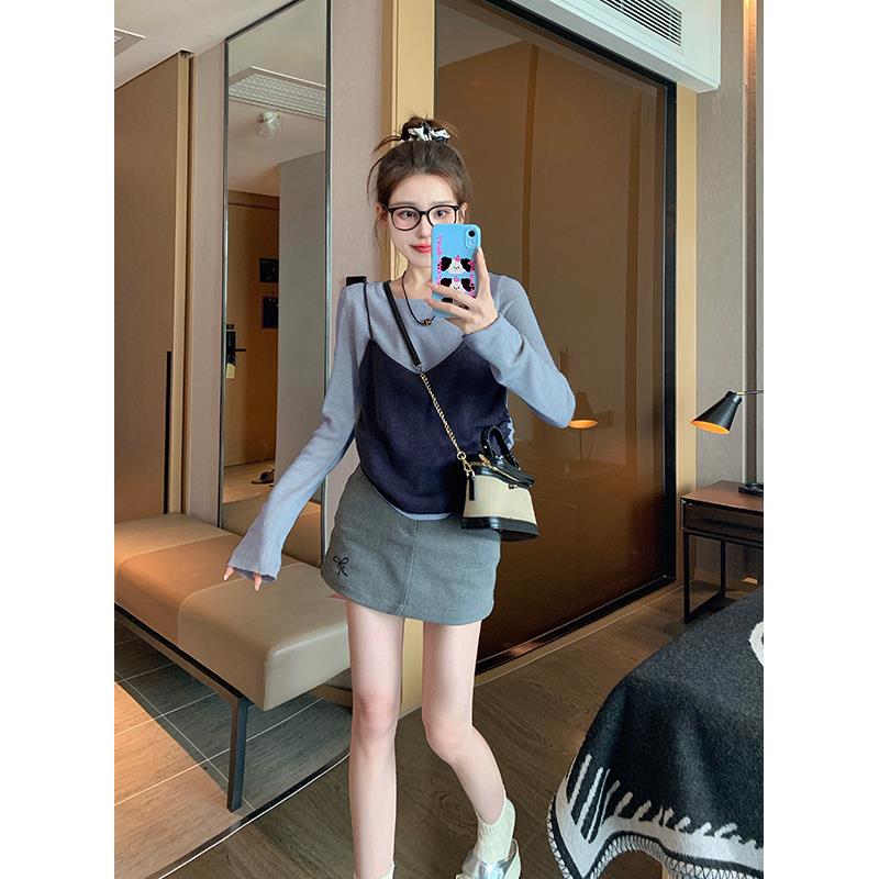 假两件针织吊带长袖t恤女2025新款早秋小个子收腰短款内搭上衣ins