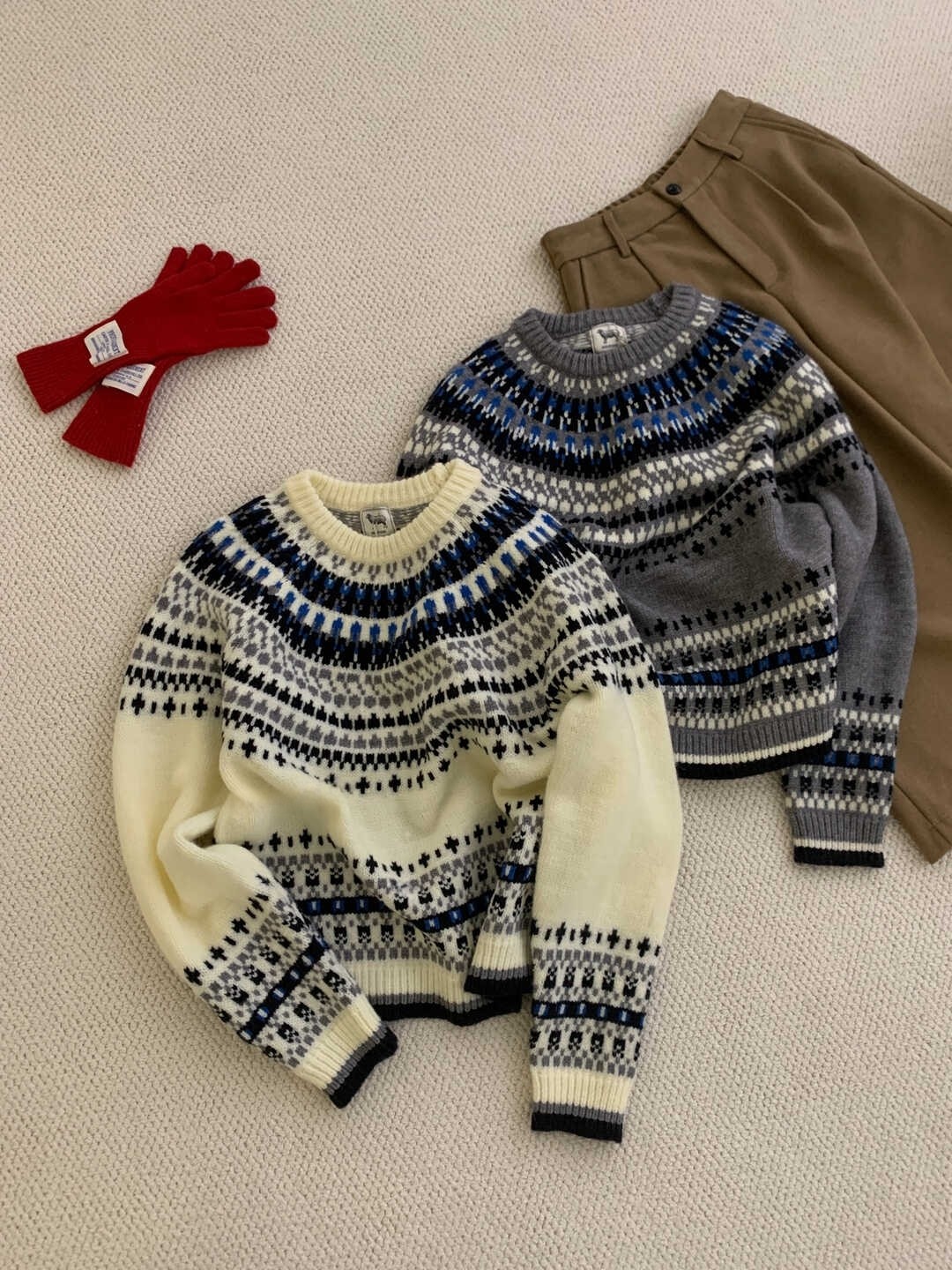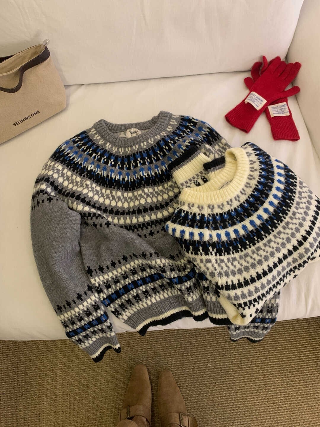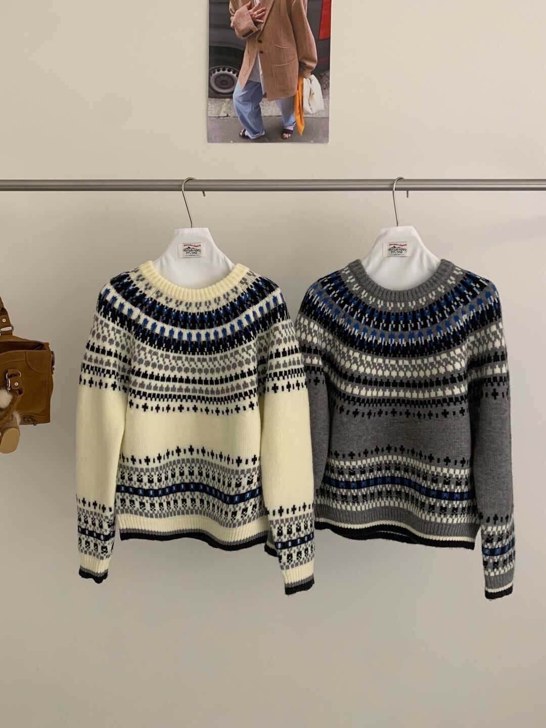 冬日复古记忆巴恩风提花随意慵懒感圆领保暖毛衣