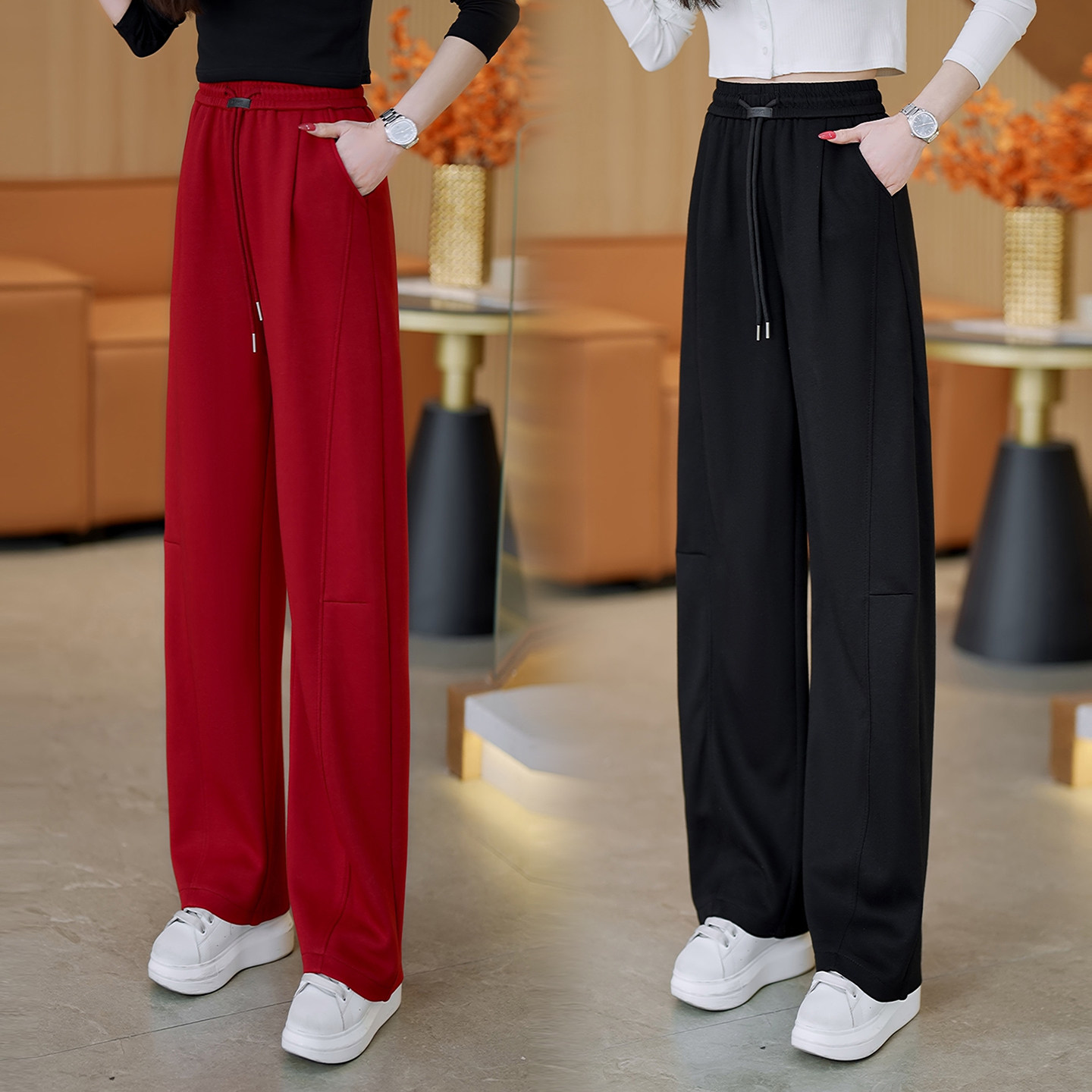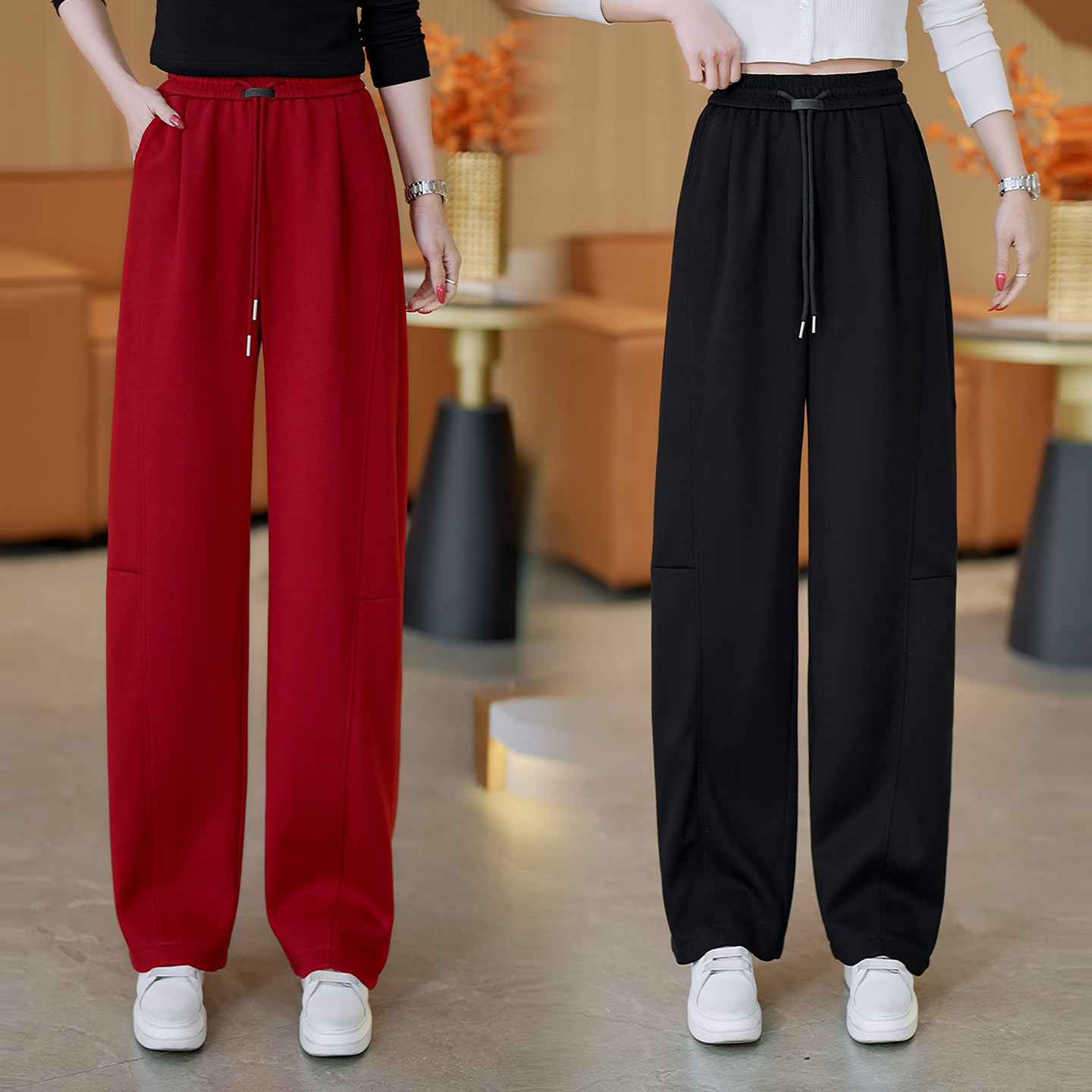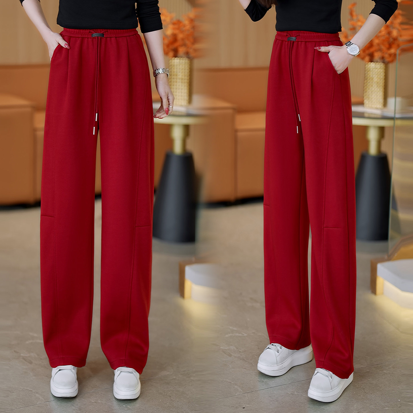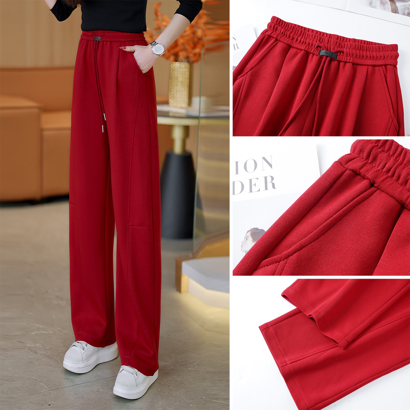 红色直筒弯刀休闲裤女春秋2026新爆款高腰显瘦卫裤宽松百搭运动裤