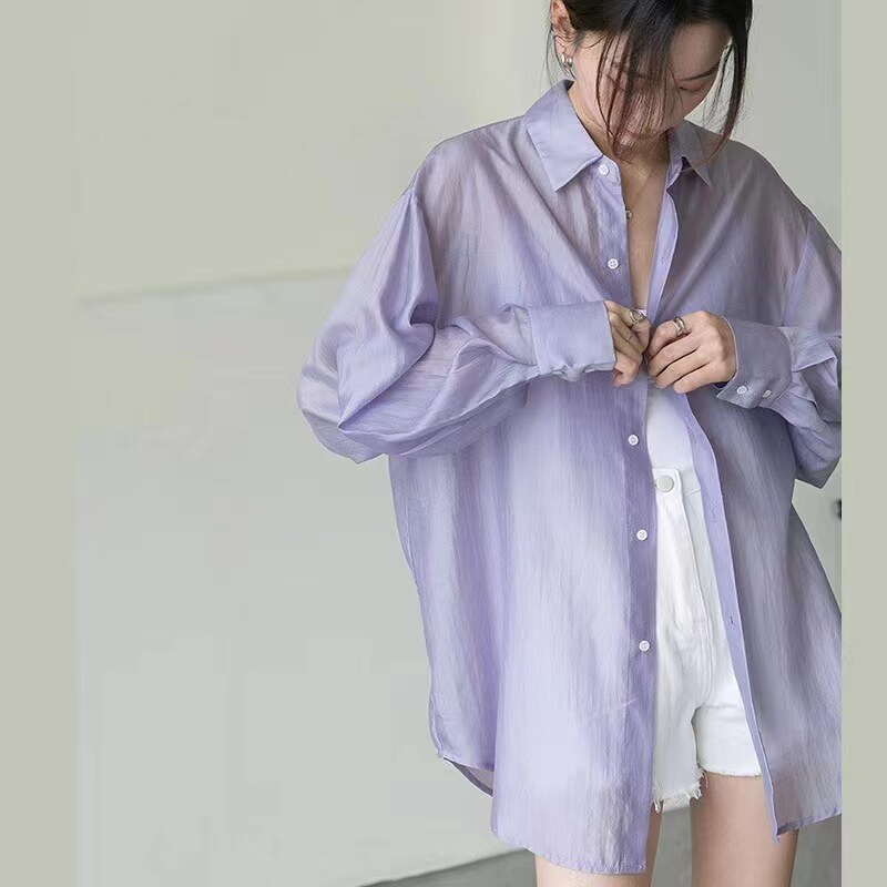 法式甜美风紫色天丝夏季防晒衬衫女长袖后背开叉设计感小众衬衣女