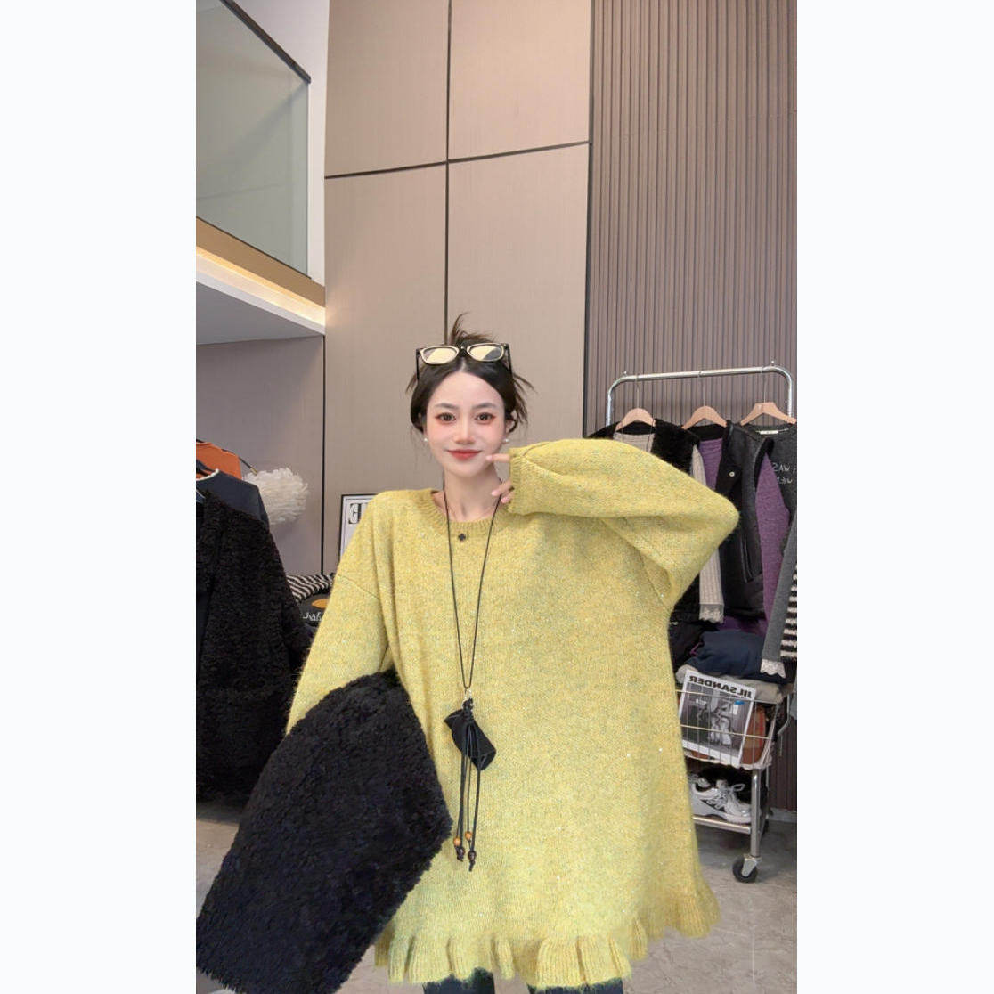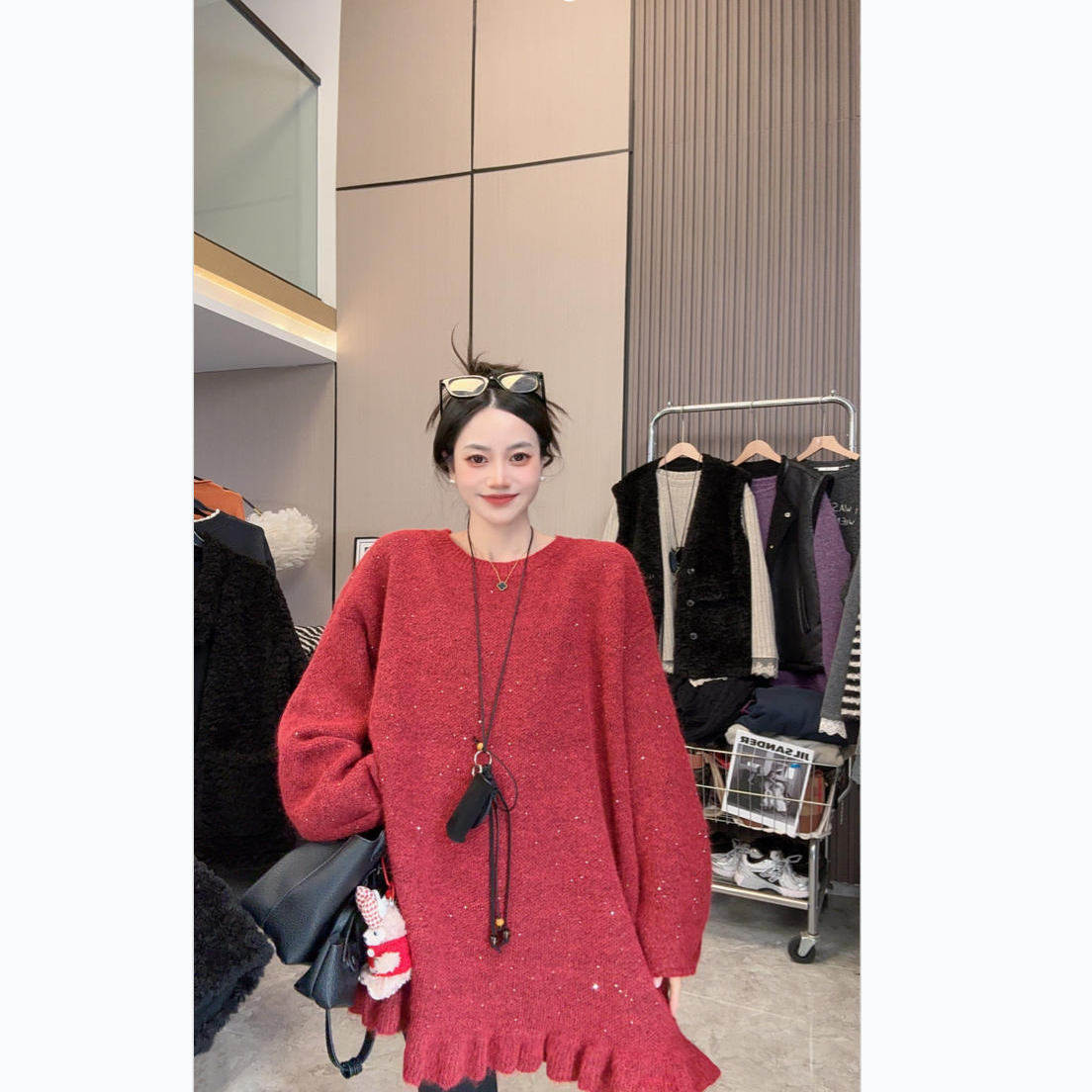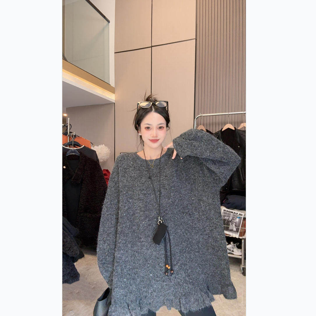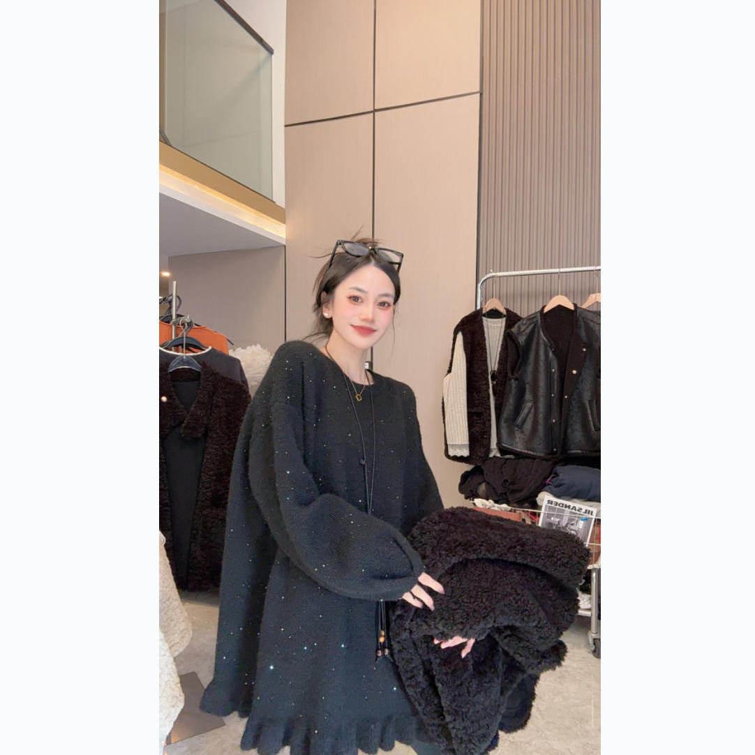 【闪闪毛衣】重工亮片~节日氛围感圆领木耳边中长款长袖毛衣