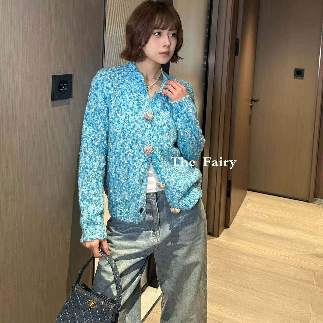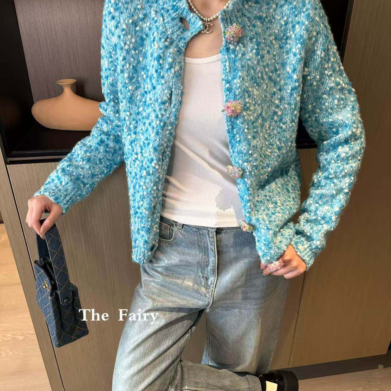 天蓝色重工扣子小香风外套女2025年冬季新款毛衣宽松休闲热销