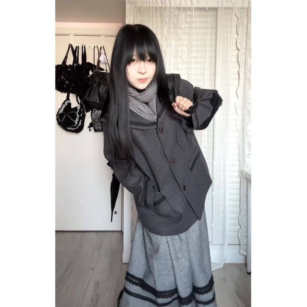 "苍山赴雪" 灰色海军领毛呢大衣+灰色半身裙学院风减龄两件套套装