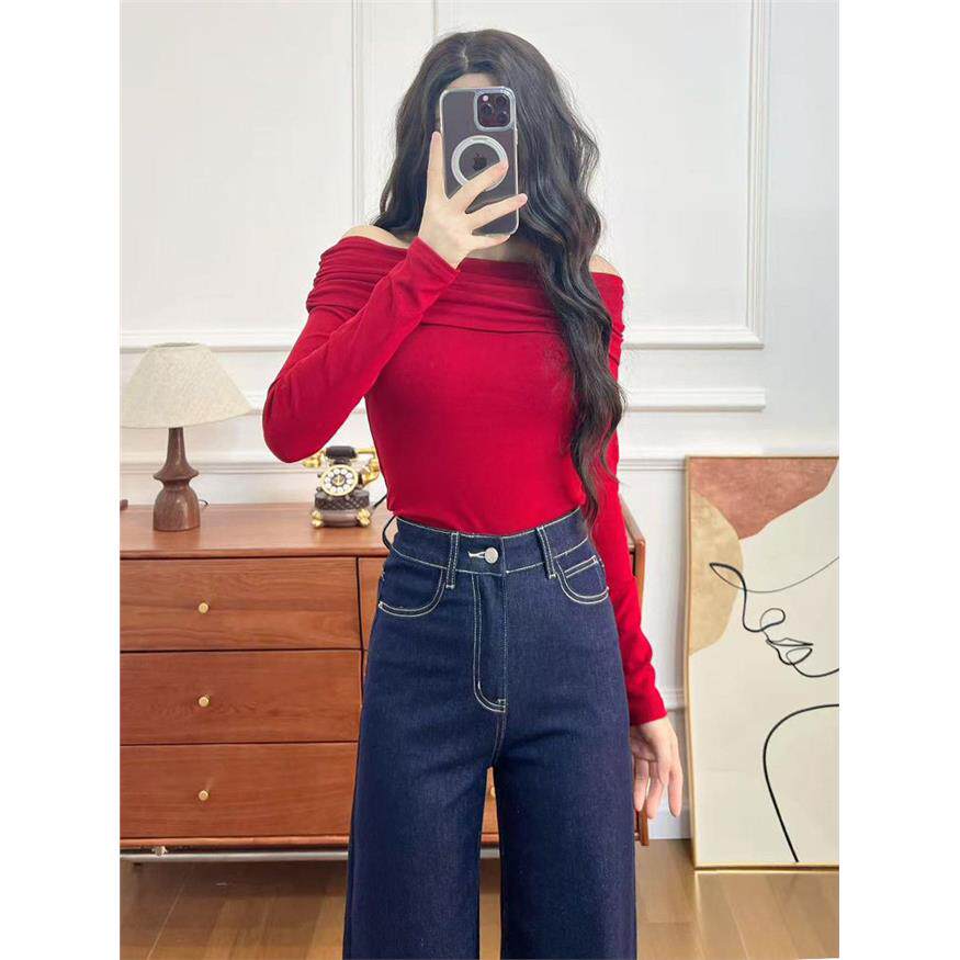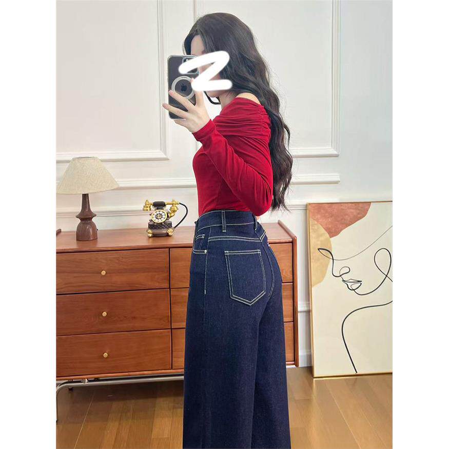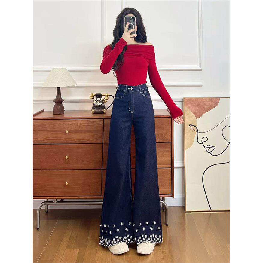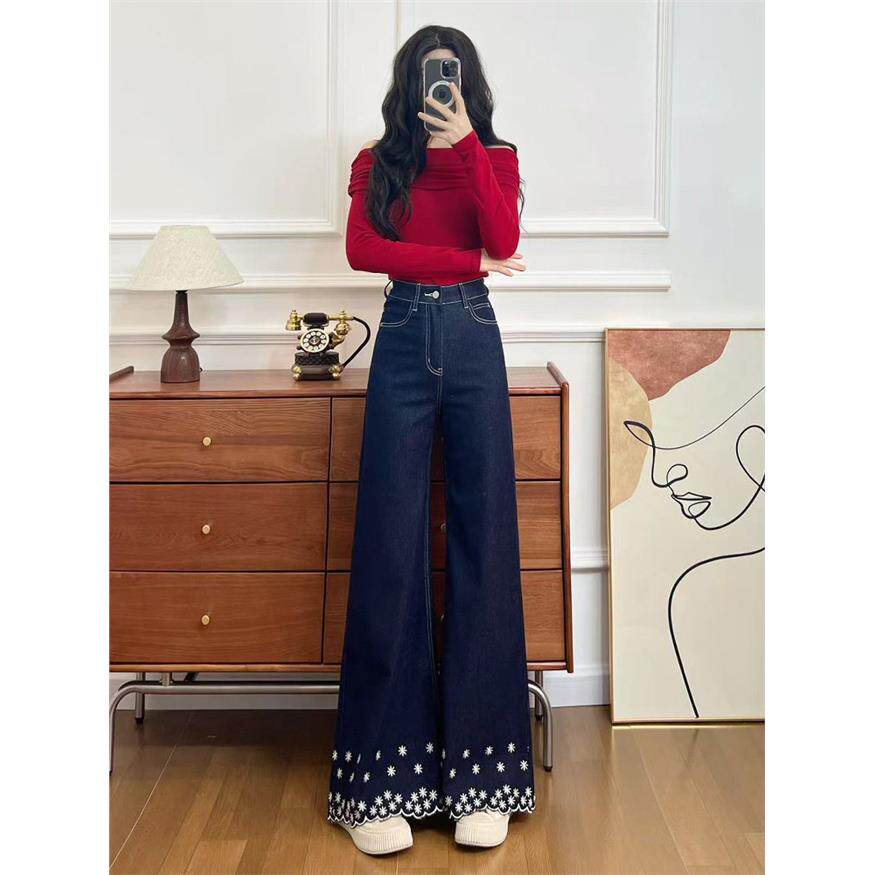刺绣阔腿牛仔裤女春秋夏季2025新款宽松时髦潮流喇叭深蓝直筒裤子