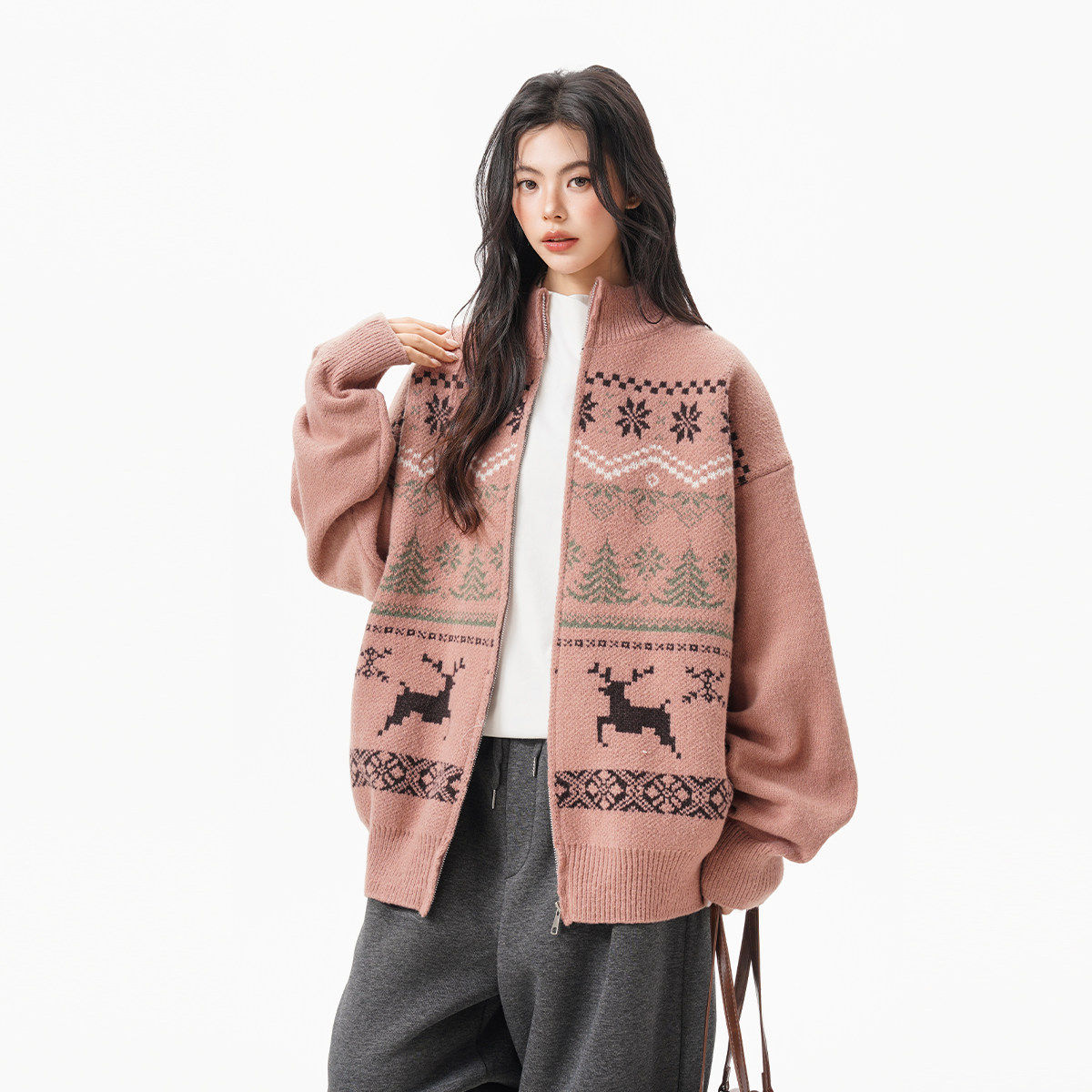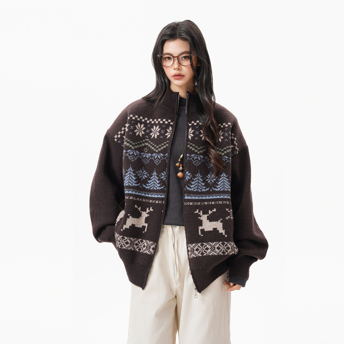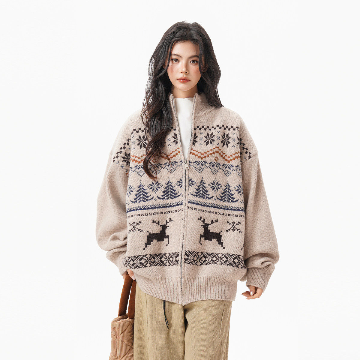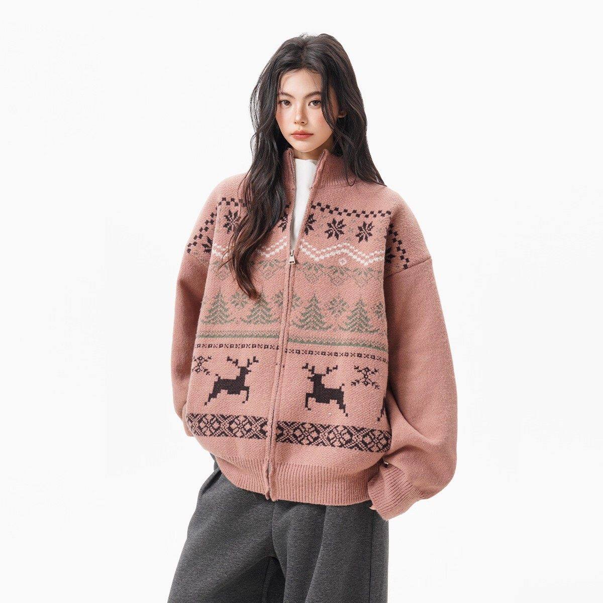 美式重磅费尔岛立领毛衣开衫女男冬季复古松弛感保暖拉链针织外套