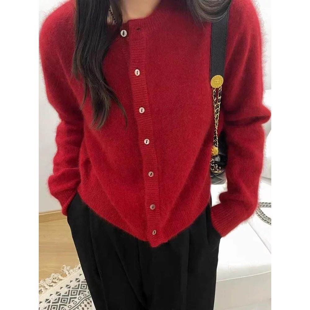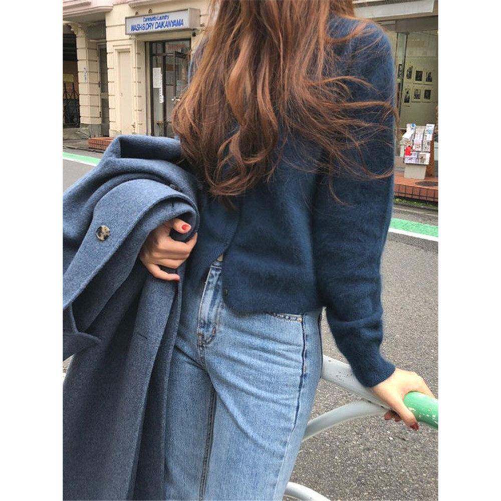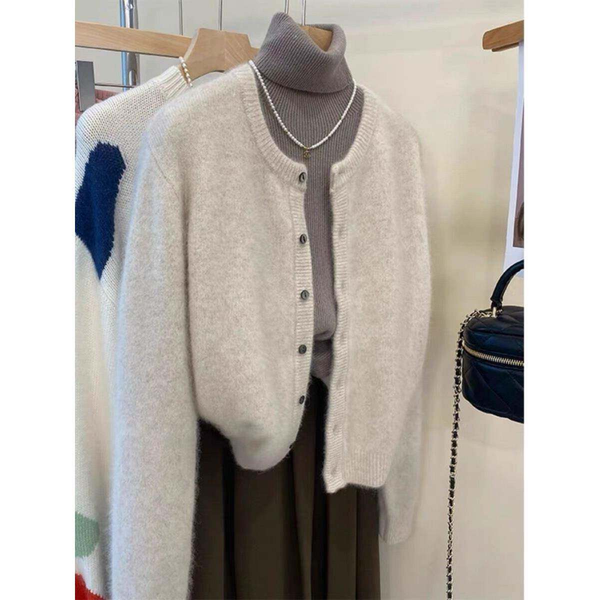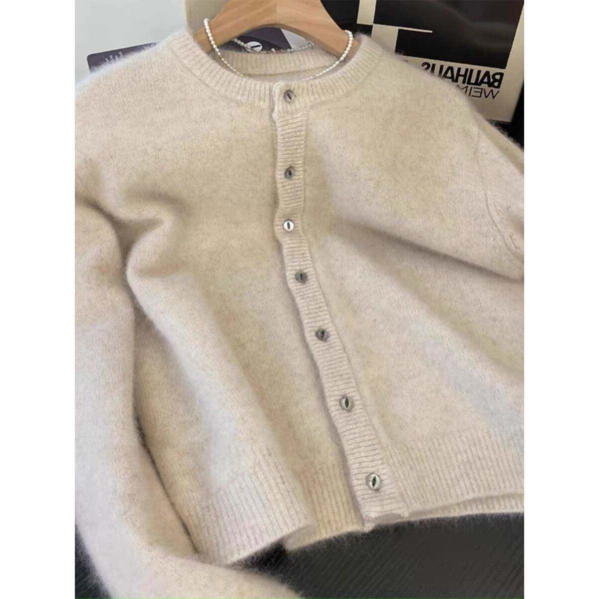 100%纯羊毛开衫女秋冬款圆领羊毛衫宽松韩版针织毛衣短款叠穿外套