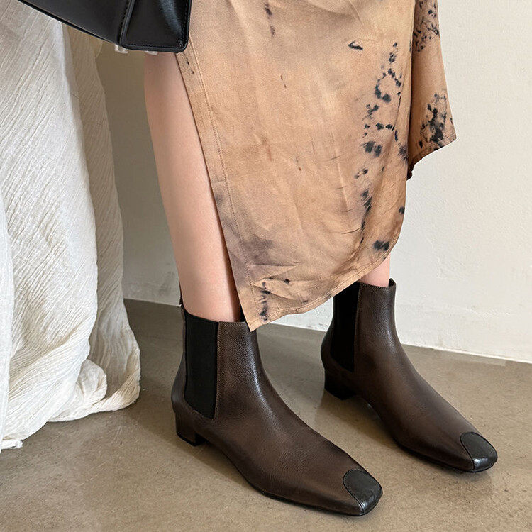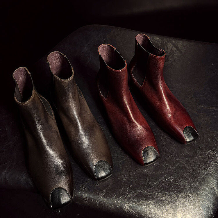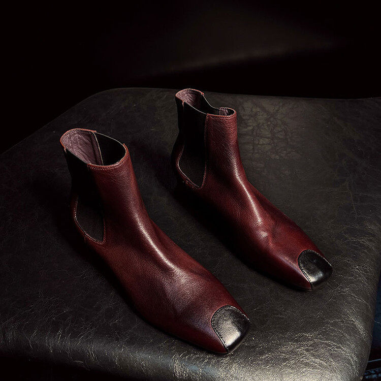 3cm羊皮平底切尔西短靴女复古方头高级感一脚蹬酒红色真皮马丁靴~