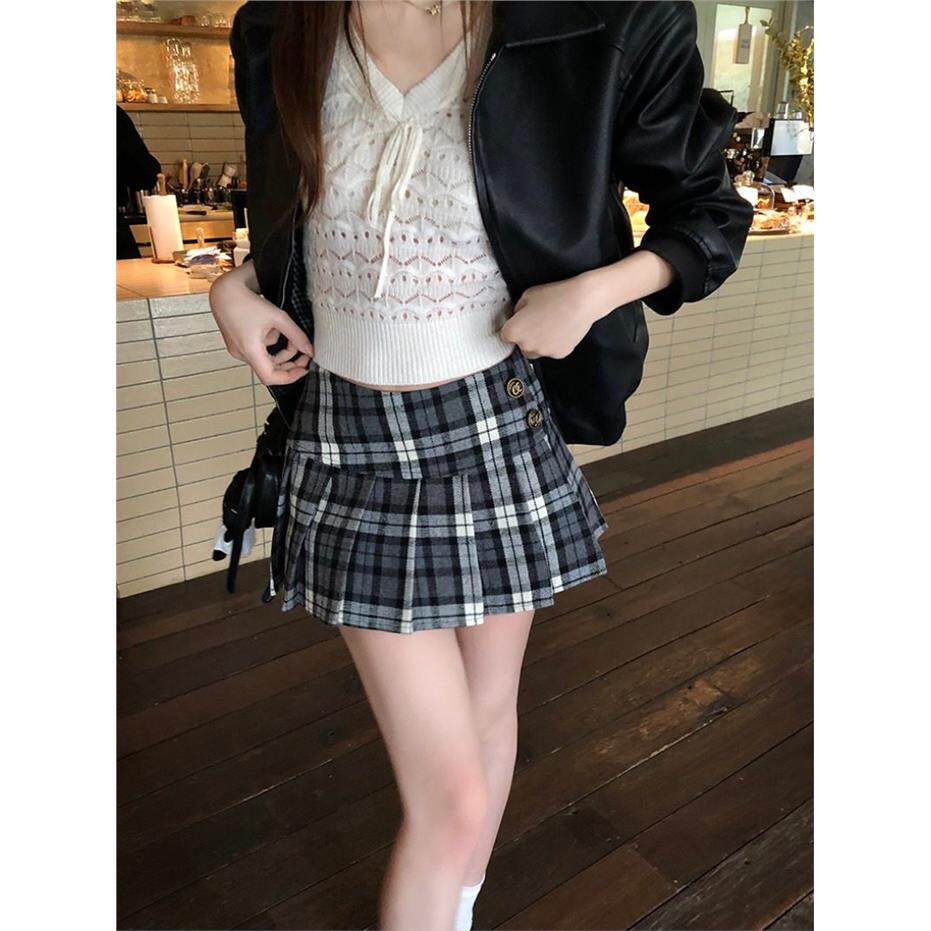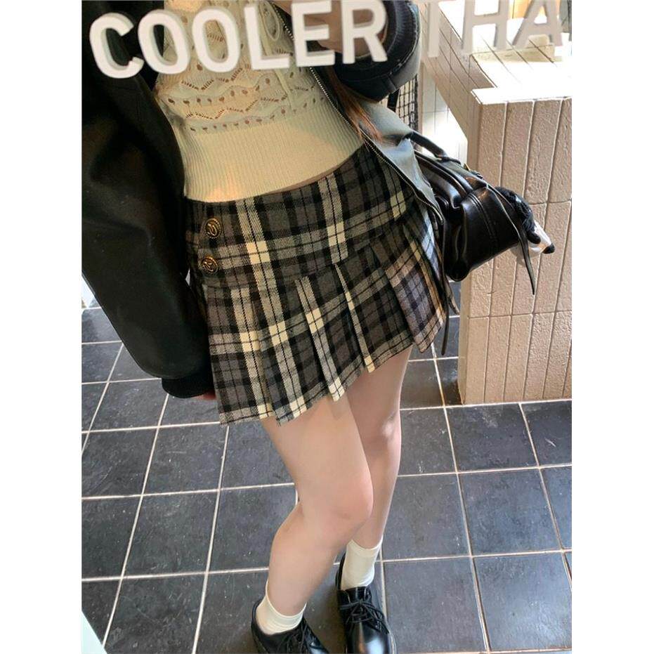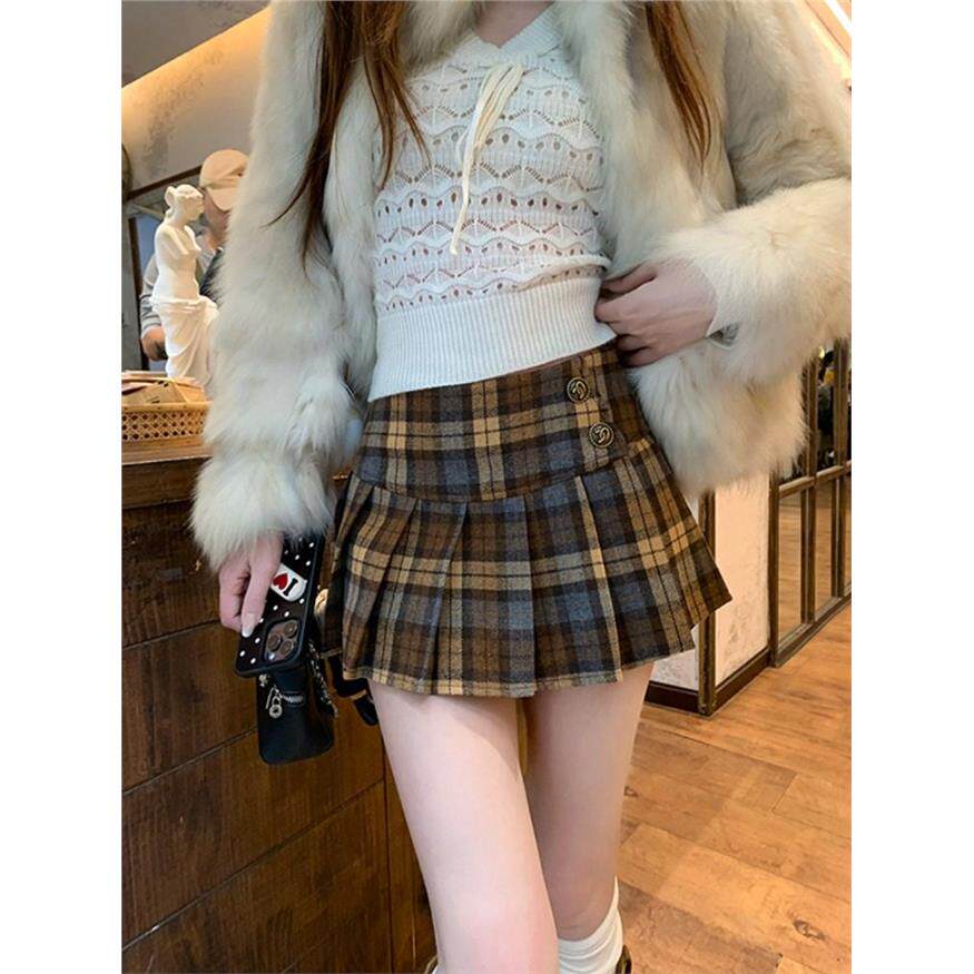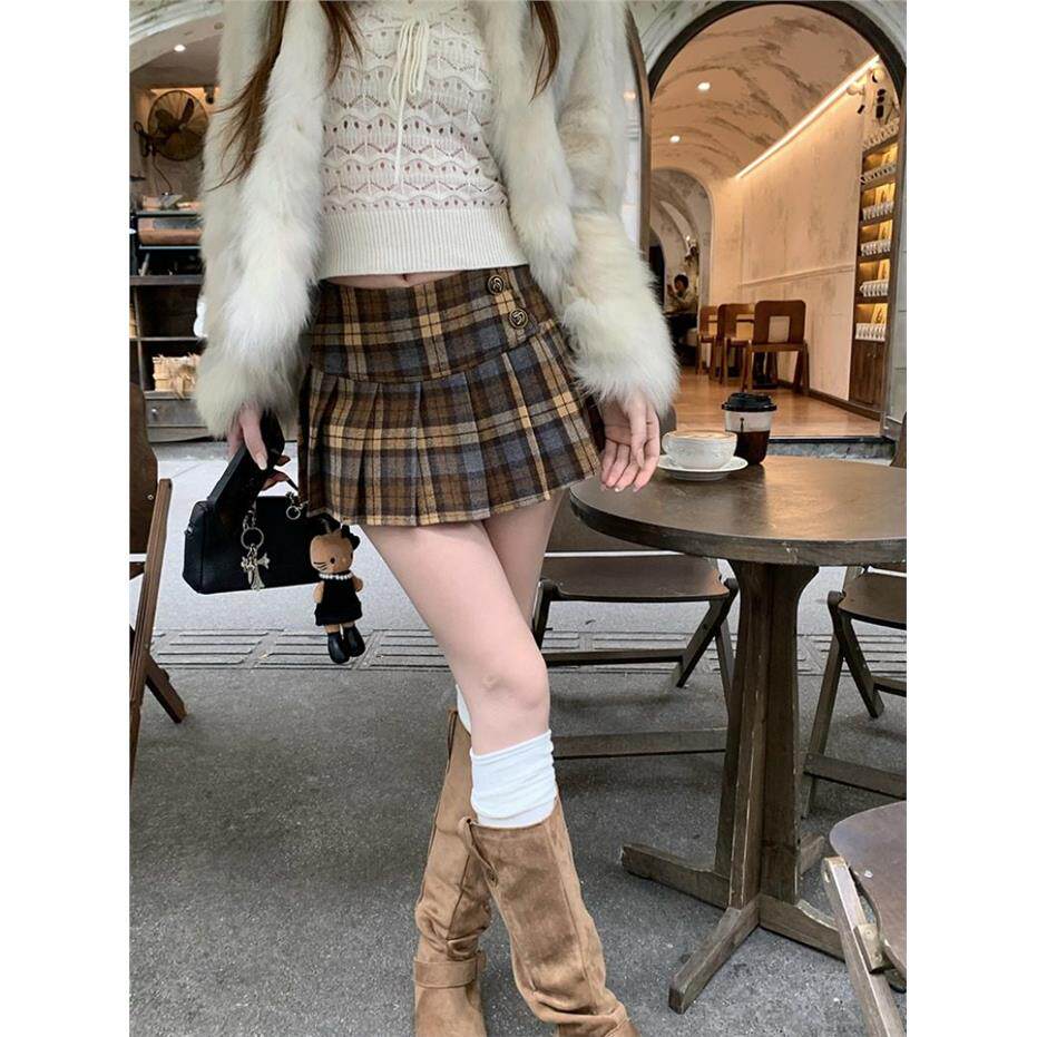 覆古撞色格纹毛呢半身裙女秋季学院风百褶裙显瘦高腰裙子a字短裙