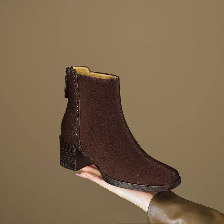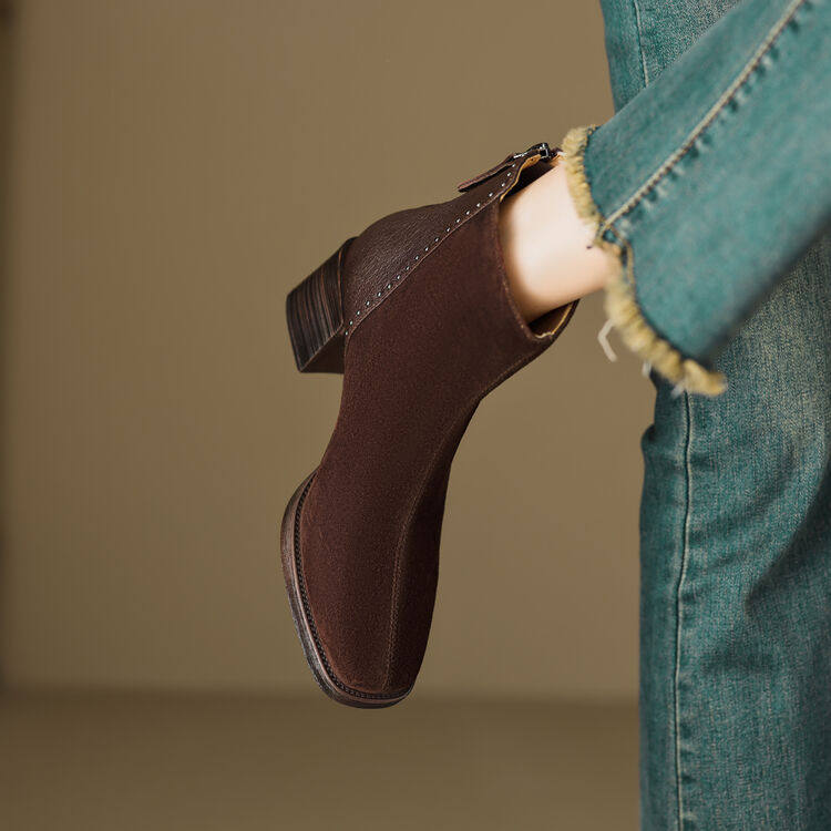 法式2024新款冬圆头粗跟中跟短靴女真皮短筒烟筒靴气质百搭时装靴