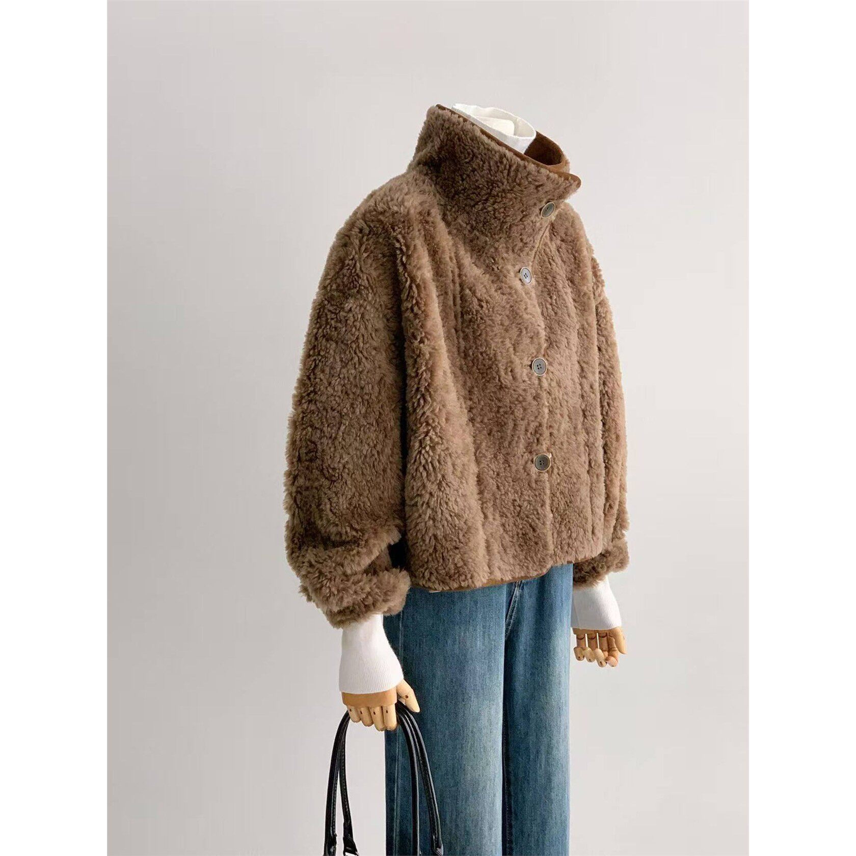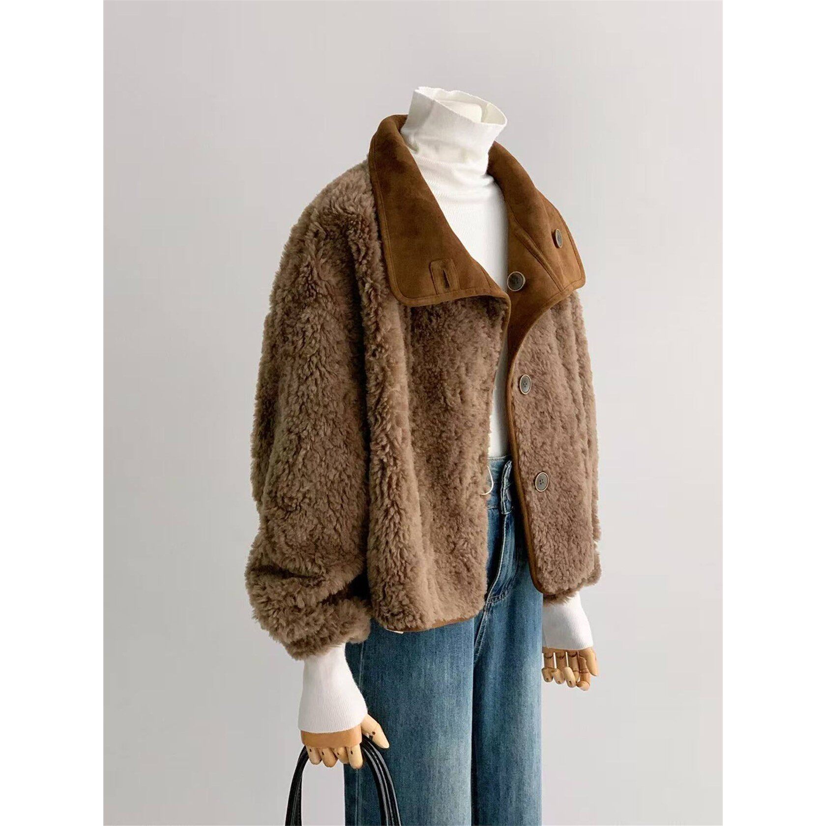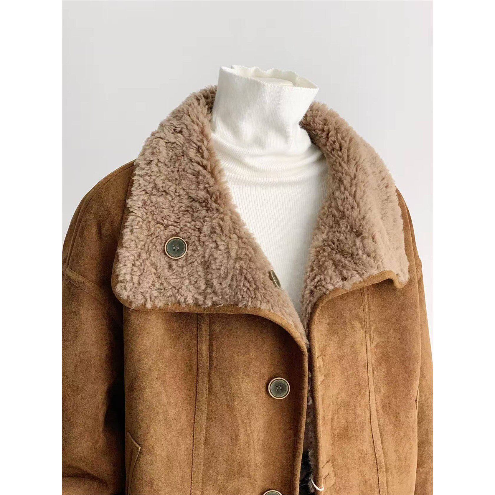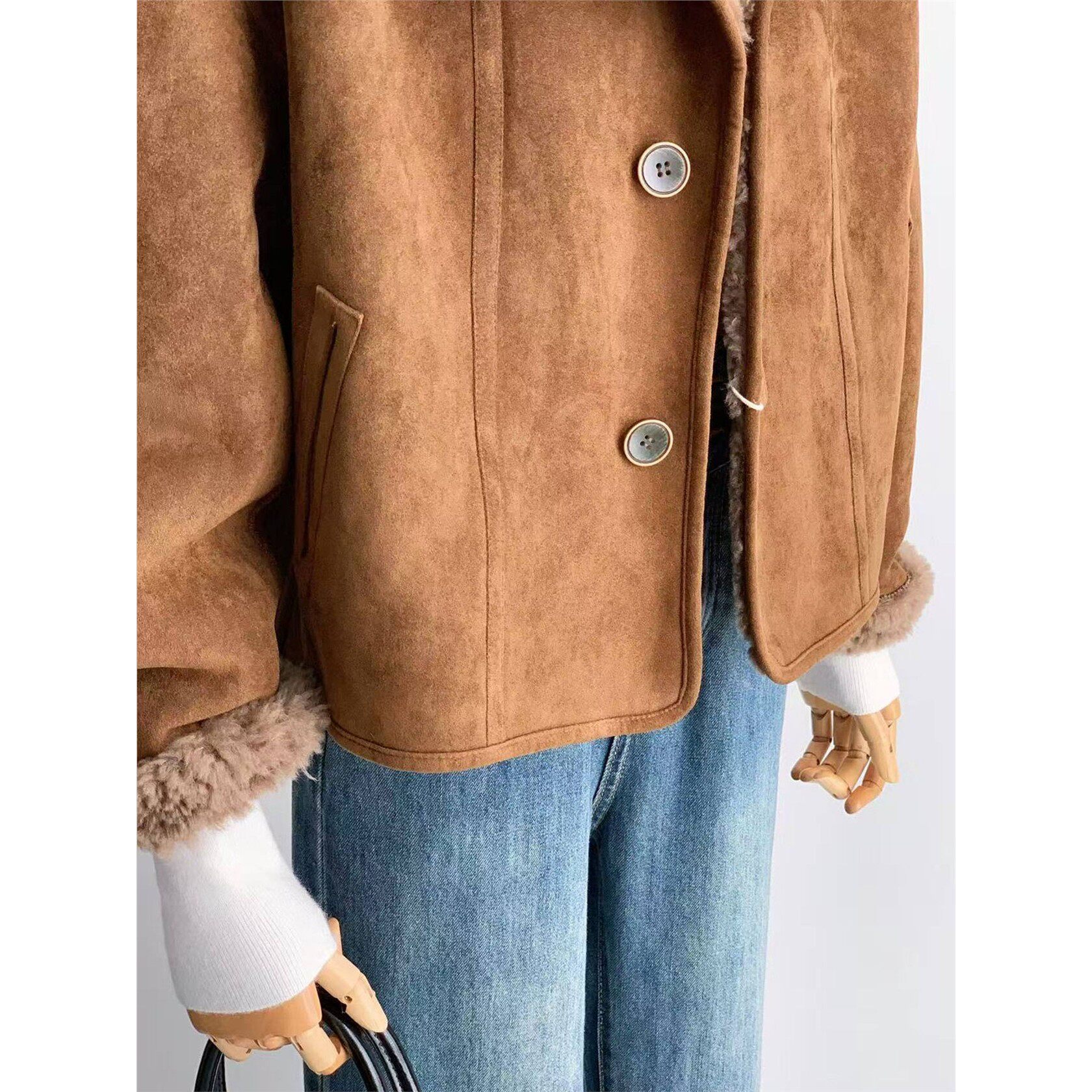 棕色小香风短款麂皮外套女2025冬季新款高级感皮毛一体两面穿夹克