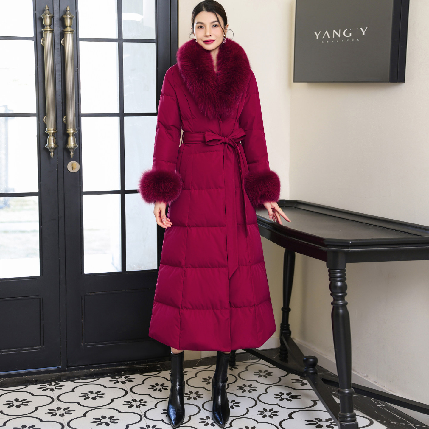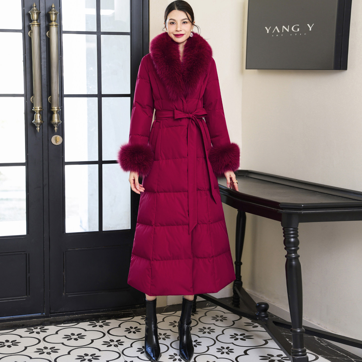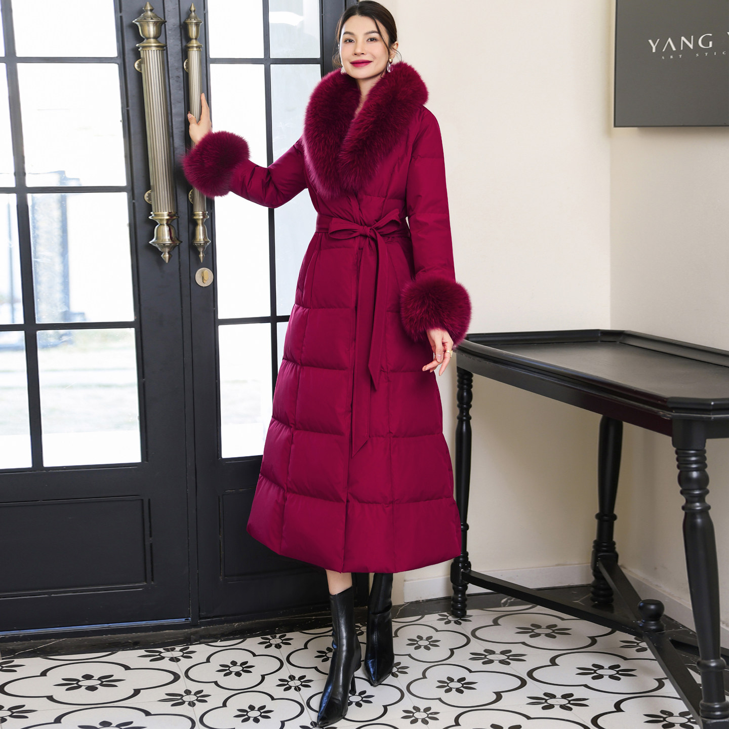 西装领过膝白鸭绒修身显瘦加厚保暖狐狸毛酒红色羽绒服女长款外套