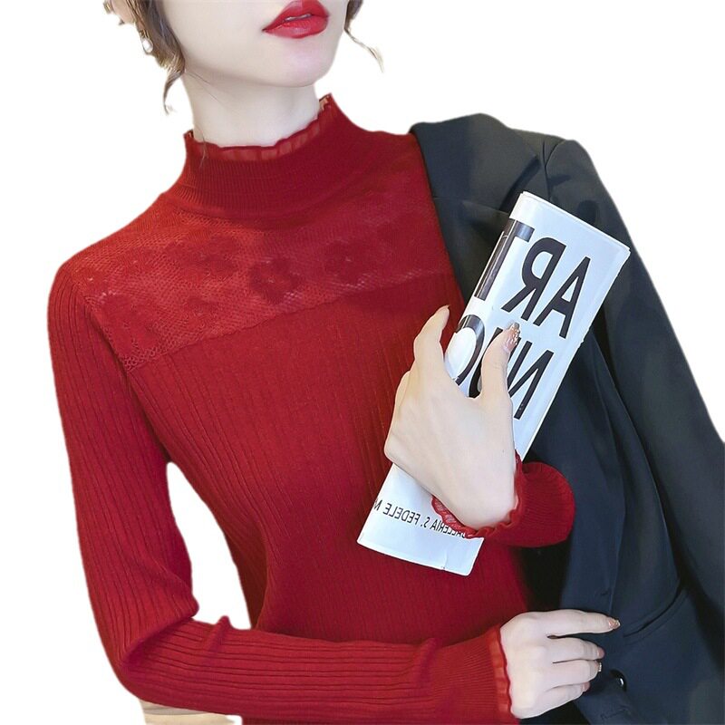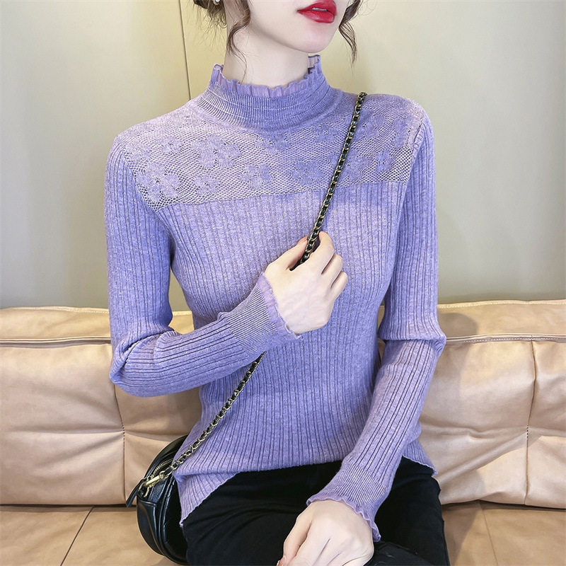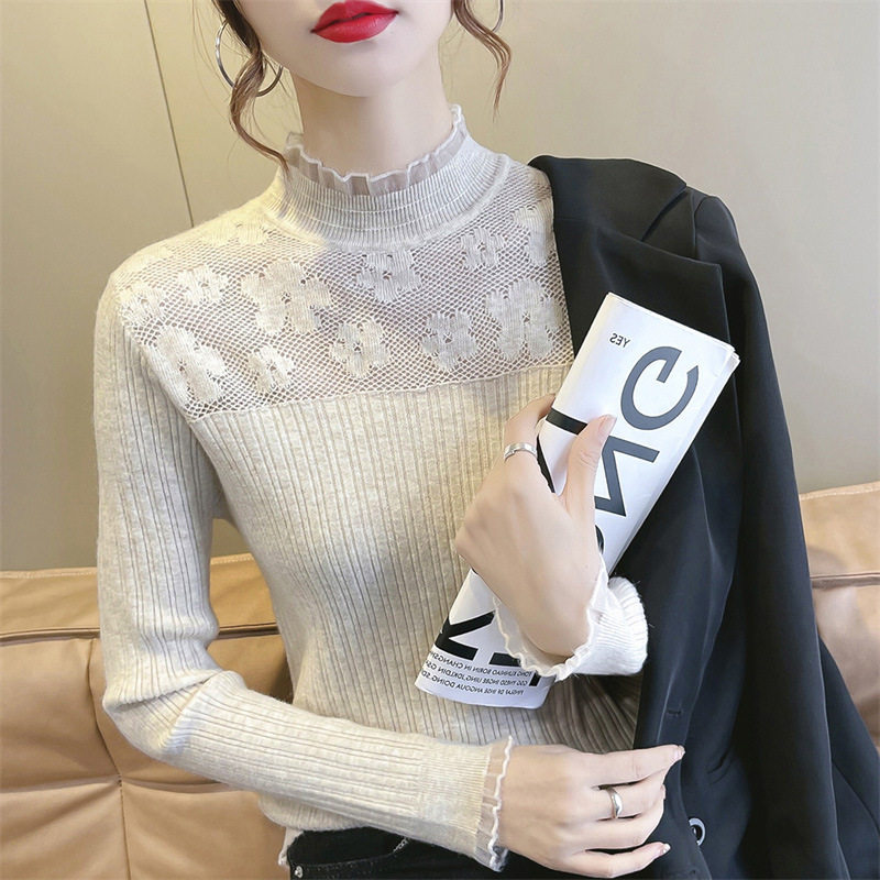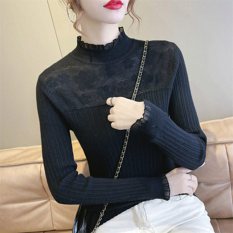 半高领打底衫秋季女装2023新款洋气百搭长袖蕾丝边花朵套头