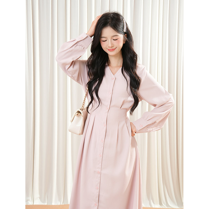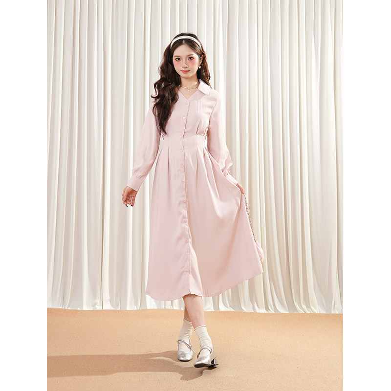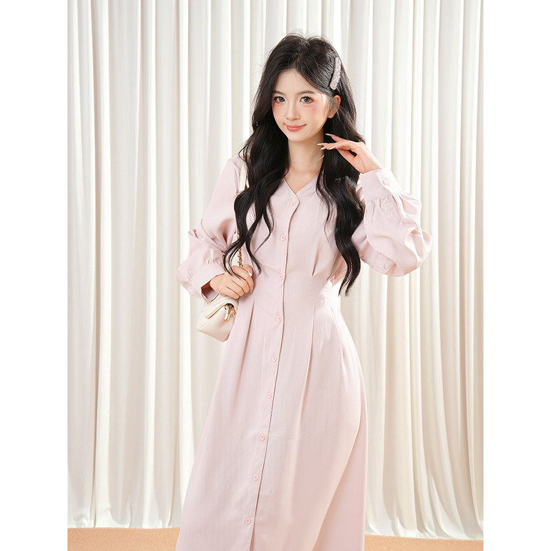 长短款粉色连衣裙2025年新款甜美收腰显瘦衬衫温柔气质到脚踝裙子