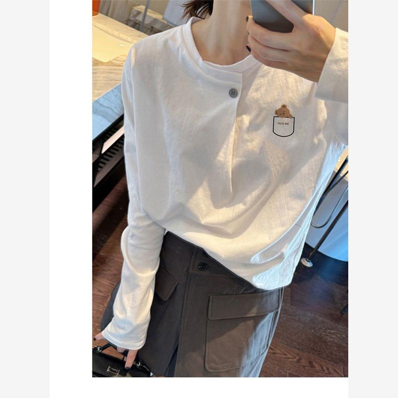 2025春秋新款韩版一粒扣白色正肩长袖T恤女宽松显瘦减龄内搭上衣