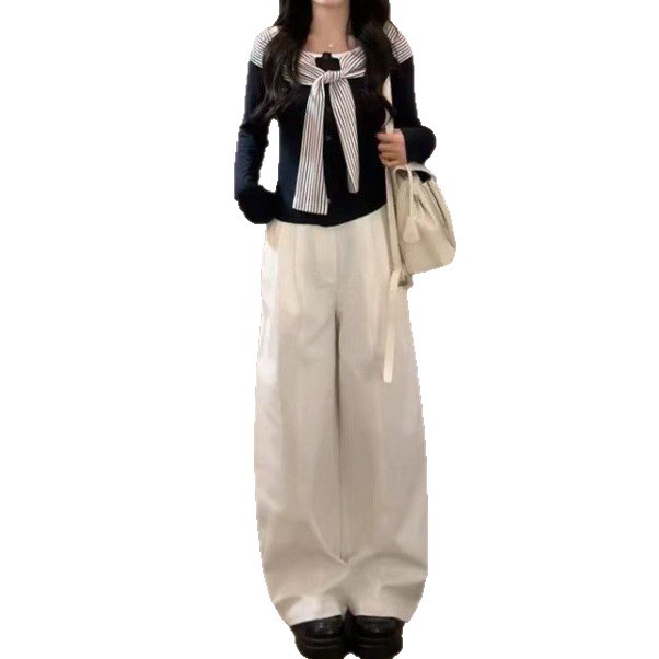 2025秋季新款韩系穿搭假两件条纹长袖上衣显瘦阔腿长裤两件套装