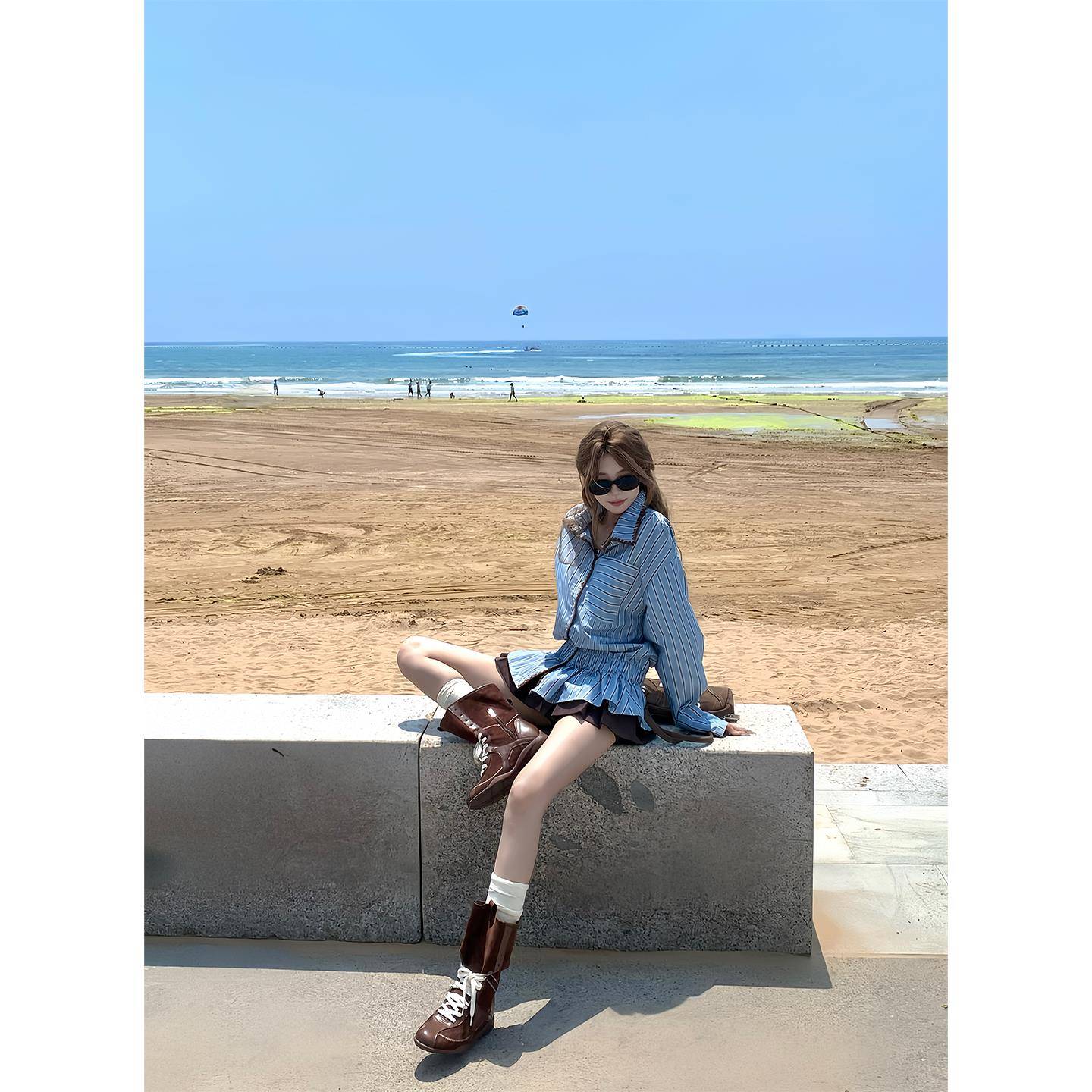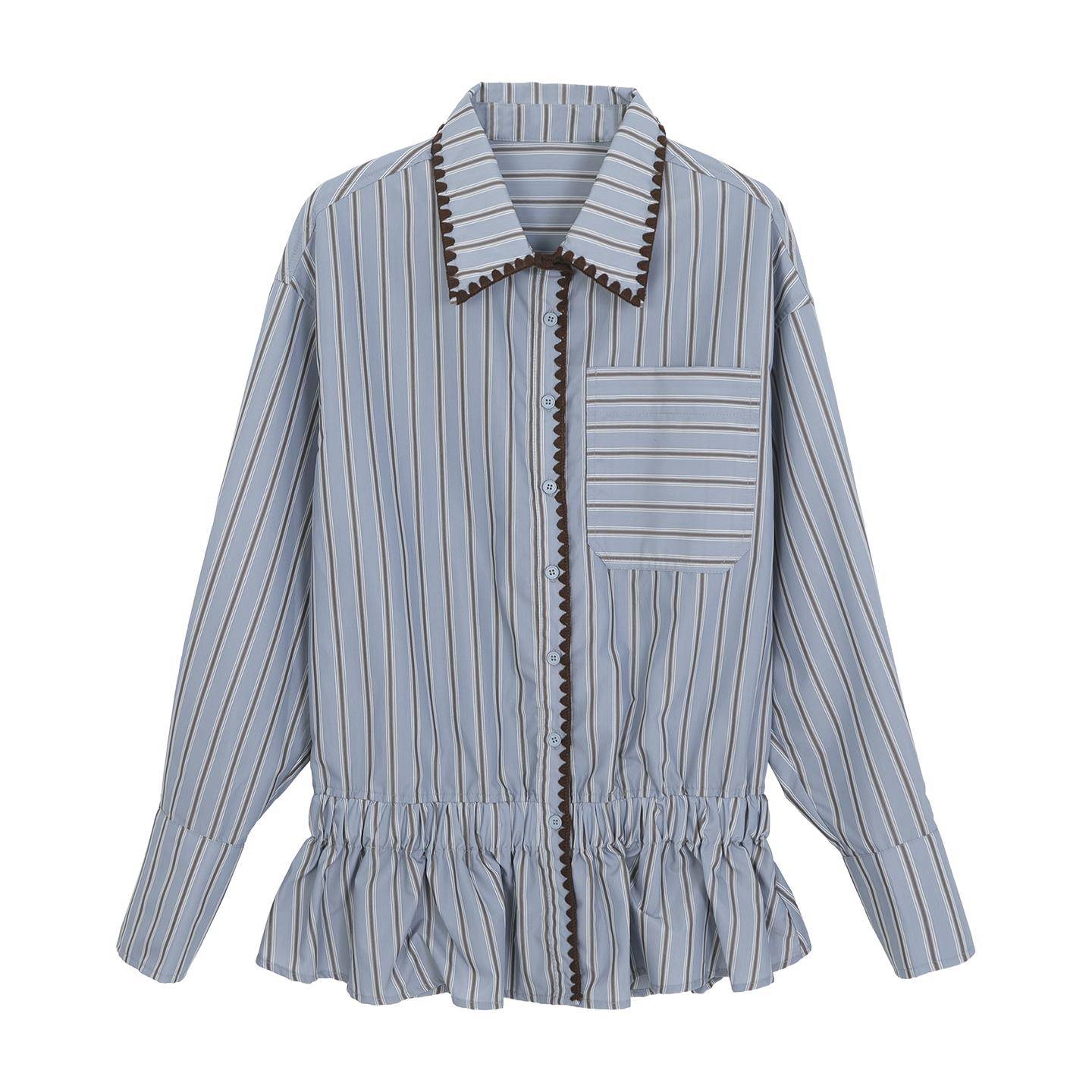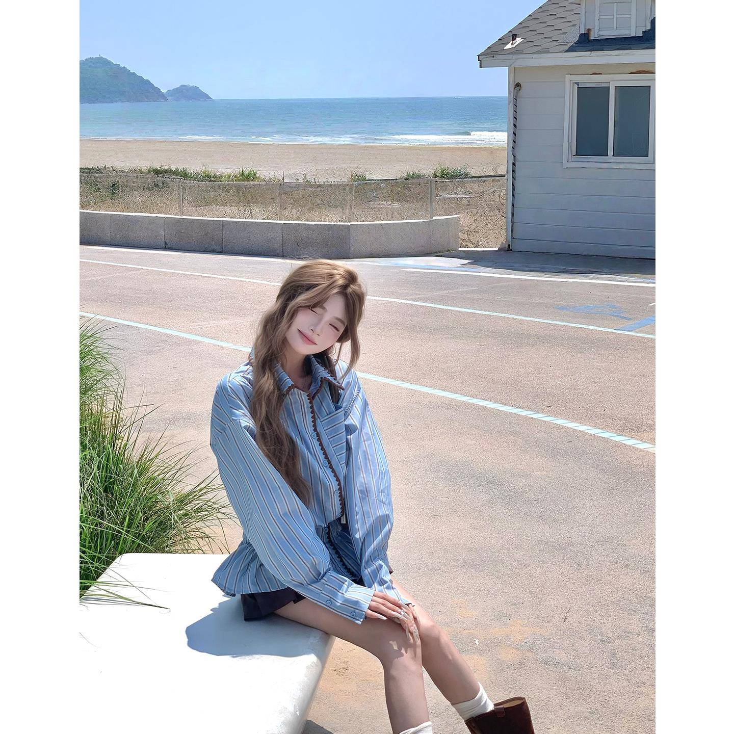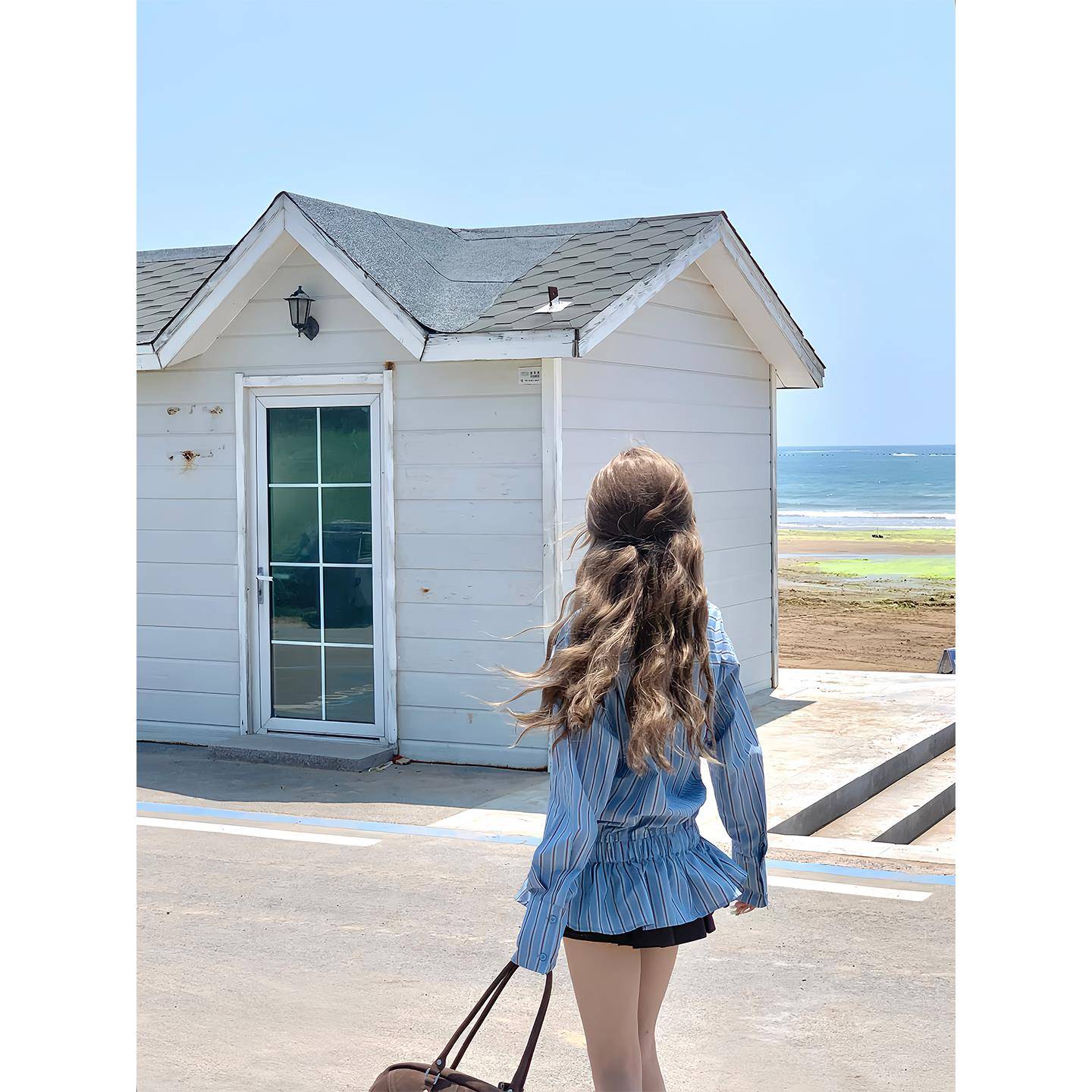 七颗虾滑条纹衬衫早秋2025新款女气质衬衫法式高级感蓝色长袖上衣